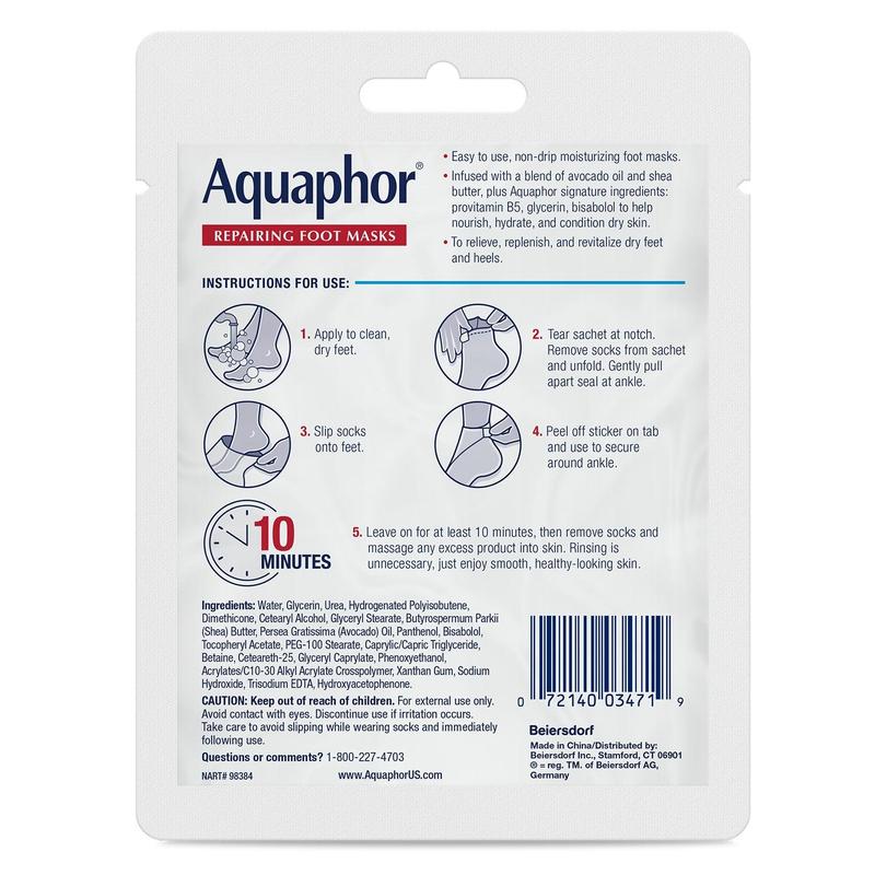 ·Hydrating Foot Care Treatment: Aquaphor Repairing Foot Masks deliver intense hydration to dry feet in just 10 minutes.