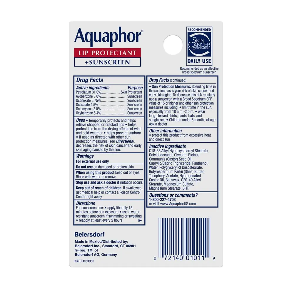 Aquaphor Lip Repair with Sunscreen SPF 30 offers long-lasting moisture and protects lips from the sun. From the #1 dermatologist recommended lip care brand, this balm relieves dryness and soothes chapped lips. Lips appear healthier with this rich formula.