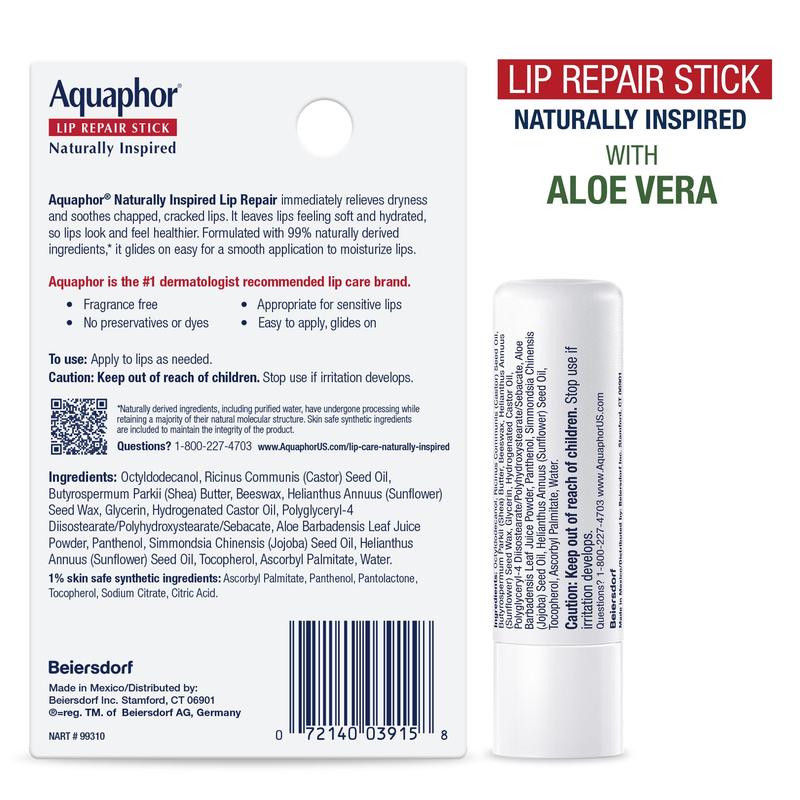 BenefitsDERMATOLOGIST RECOMMENDED: Aquaphor is the #1 dermatologist recommended lip care brand. Nourishing Formula: Formulated with 99% naturally derived ingredients* nourishing vitamins,& Natural Shea Butter. Aquaphor® Naturally Inspired Lip Repair immediately relieves dryness and soothes chapped,cracked lips. It leaves lips feeling soft and hydrated,so lips look and feel healthier. Fragrance free. Appropriate for sensitive lips. No preservatives or dyes. Easy to apply,glides on"