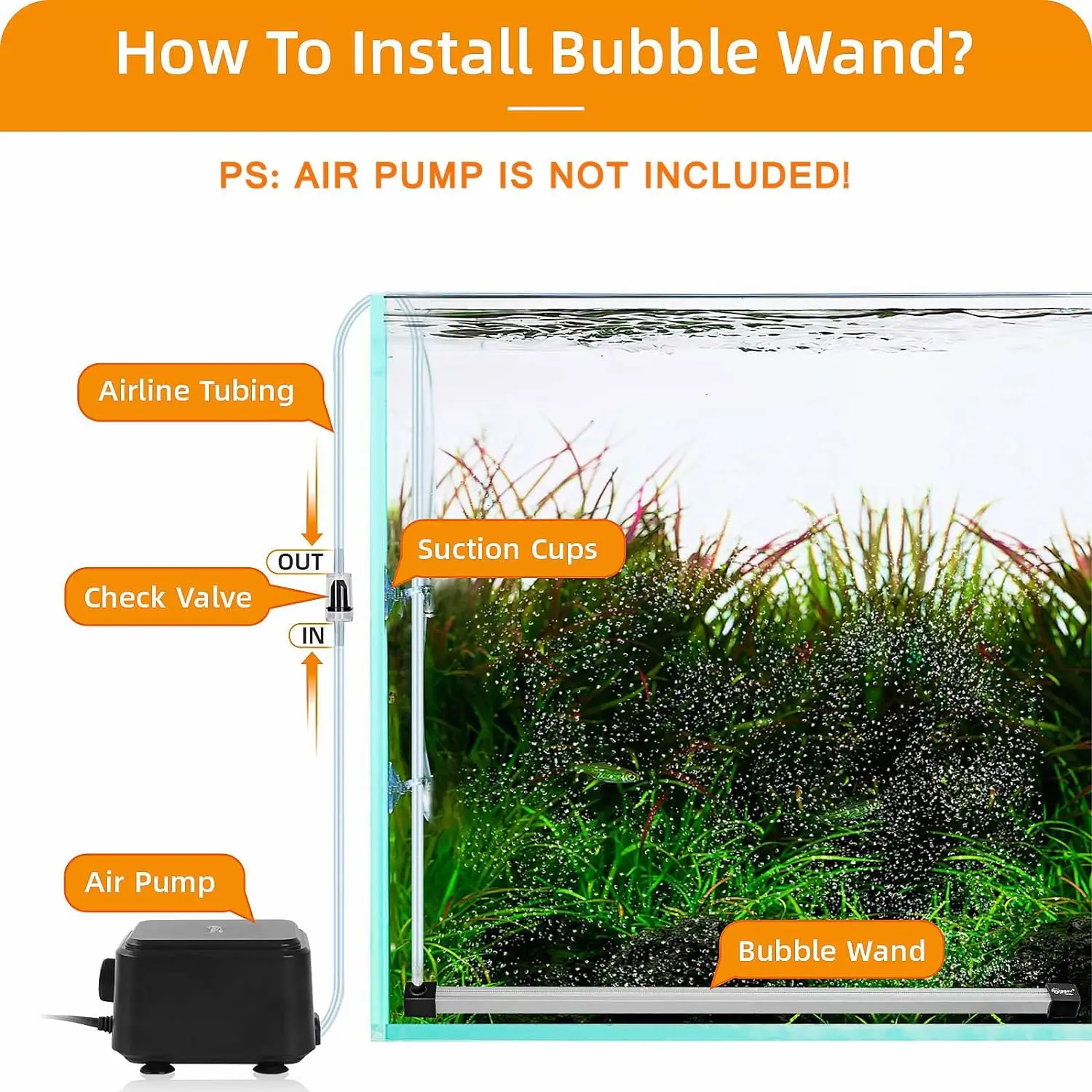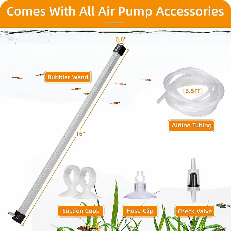 It contains a long bubbler wand, 6.5-ft long rubber hose, 2 suction cups to help bubble wand attach to glass and 1 hose clip to attach airtubing, lastly, 1 check valve to prevent siphoning.