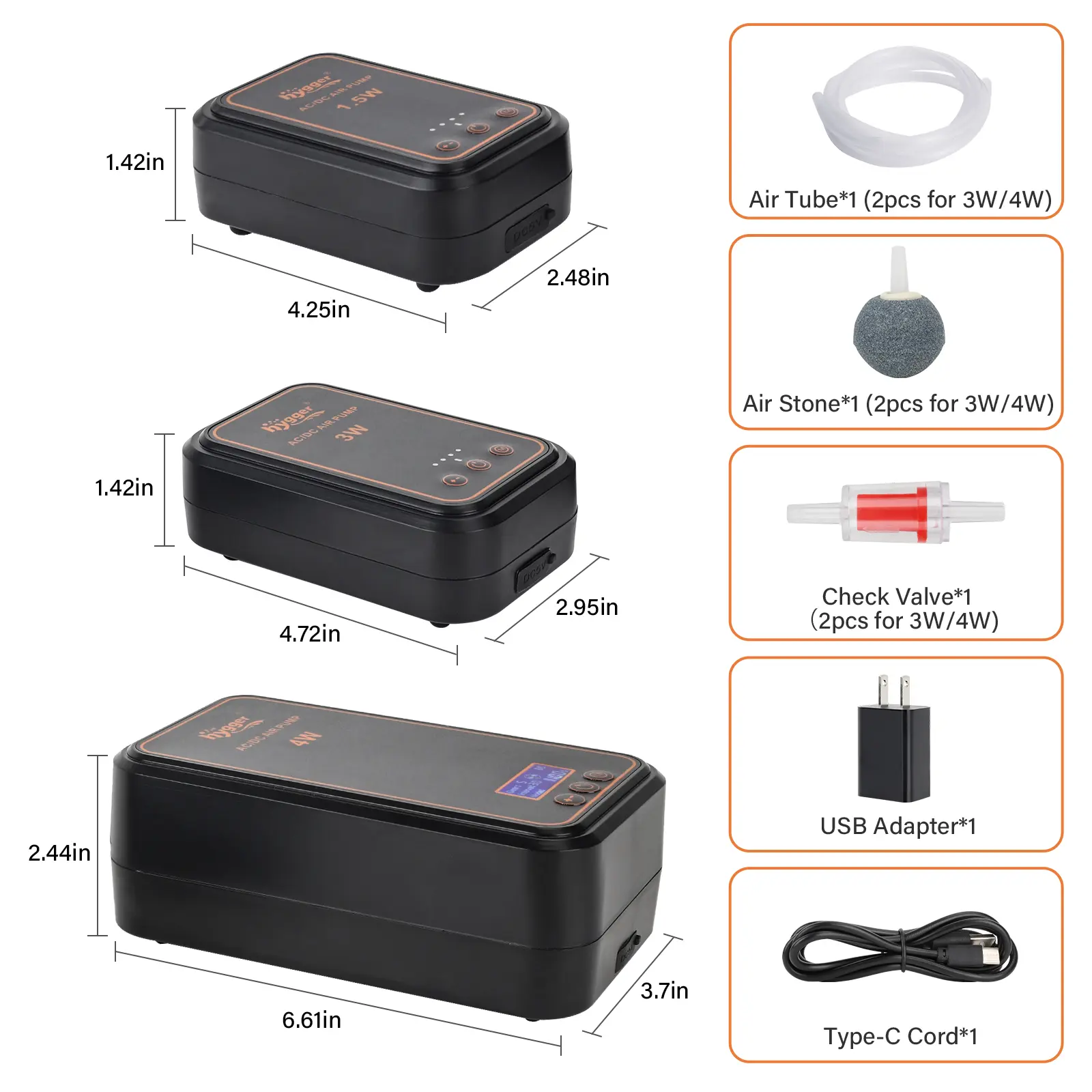 Includes air tubes, stones, valves, USB cable, adapter