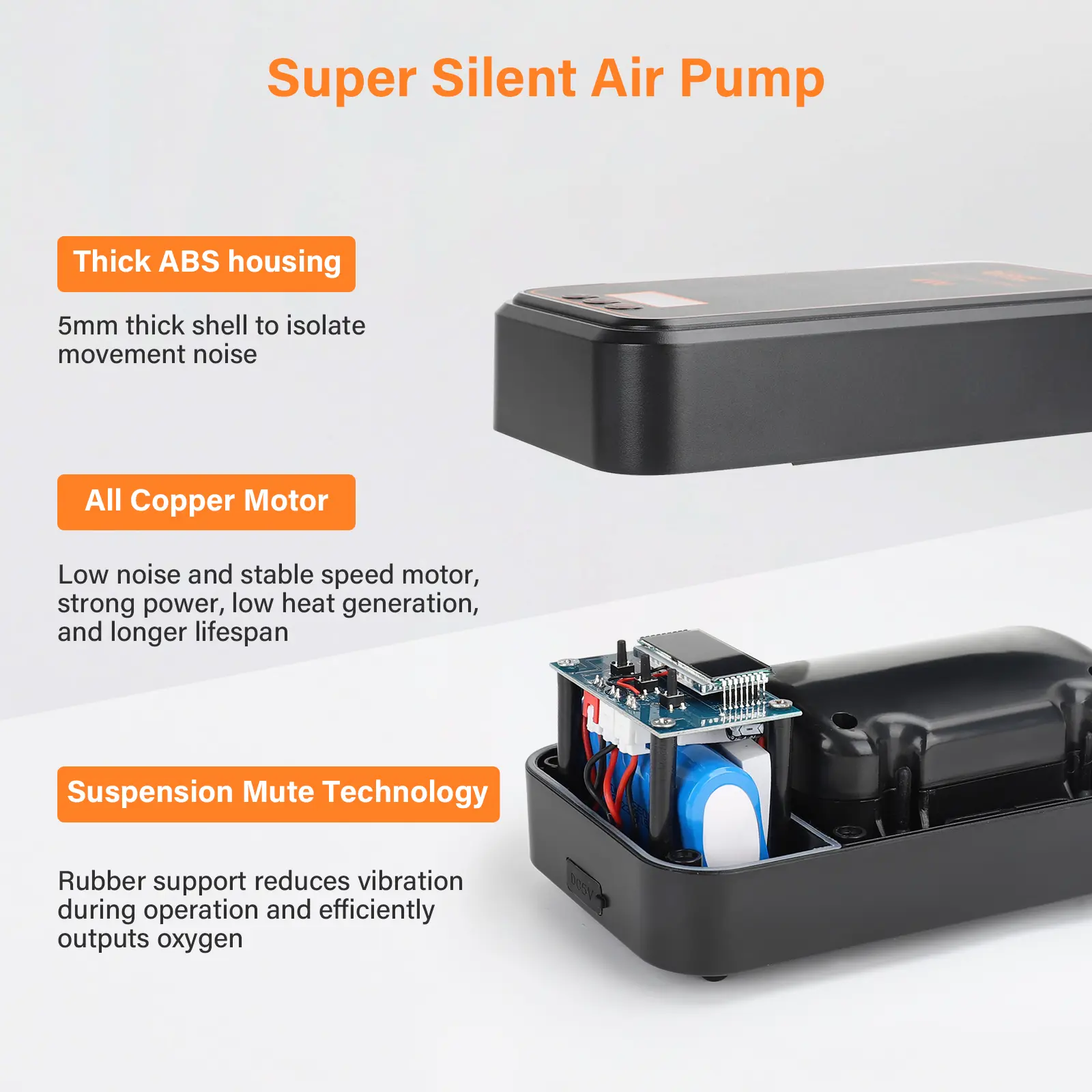 Thickened ABS + rubber feet = almost silent