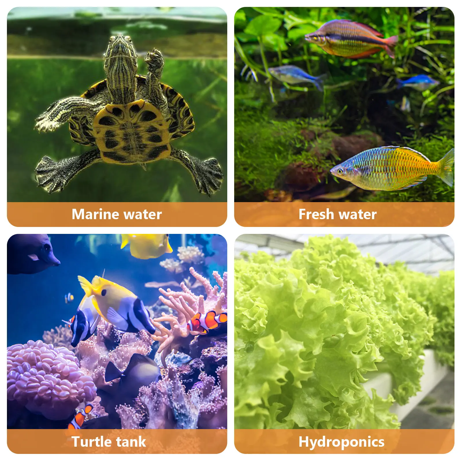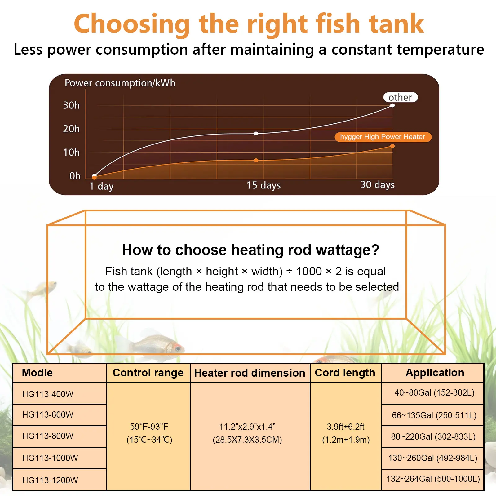Fish tank (length × height × width) ÷ 1000 × 2 is equal to the wattage of the fish heater that needs to be selected. This 800w adjustable aquarium heater is suitable for aquariums of 80 to 220 gallons. It can be used not only in home fish tanks, but also in fish markets, a