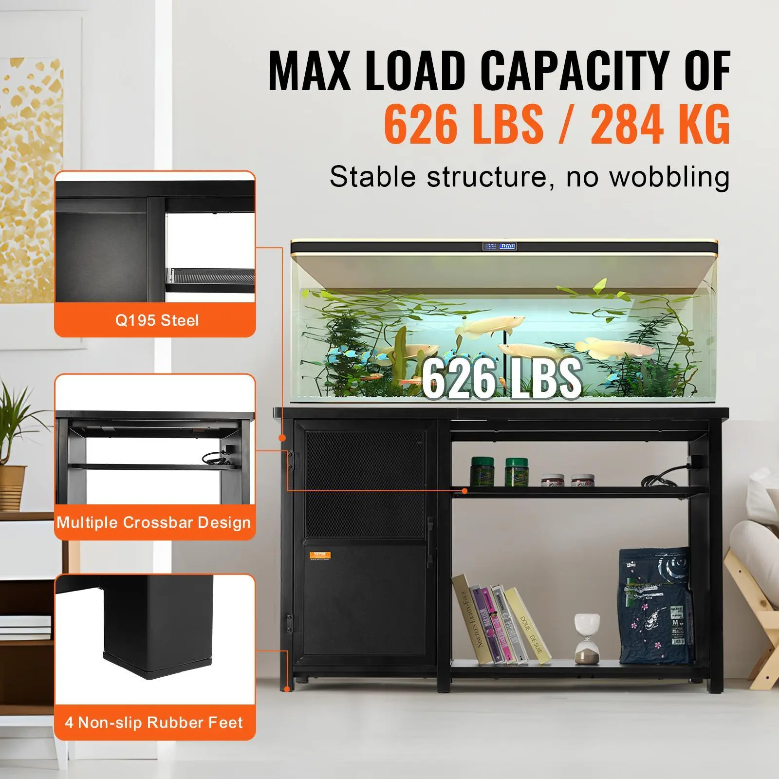 • Robust Load Capacity: The fish tank stand is constructed with multiple crossbar steel frames. Fixed rubber feet adapt to uneven surfaces, providing non-slip and leveling functions. It can support a maximum weight of 284 kg / 626 lbs.