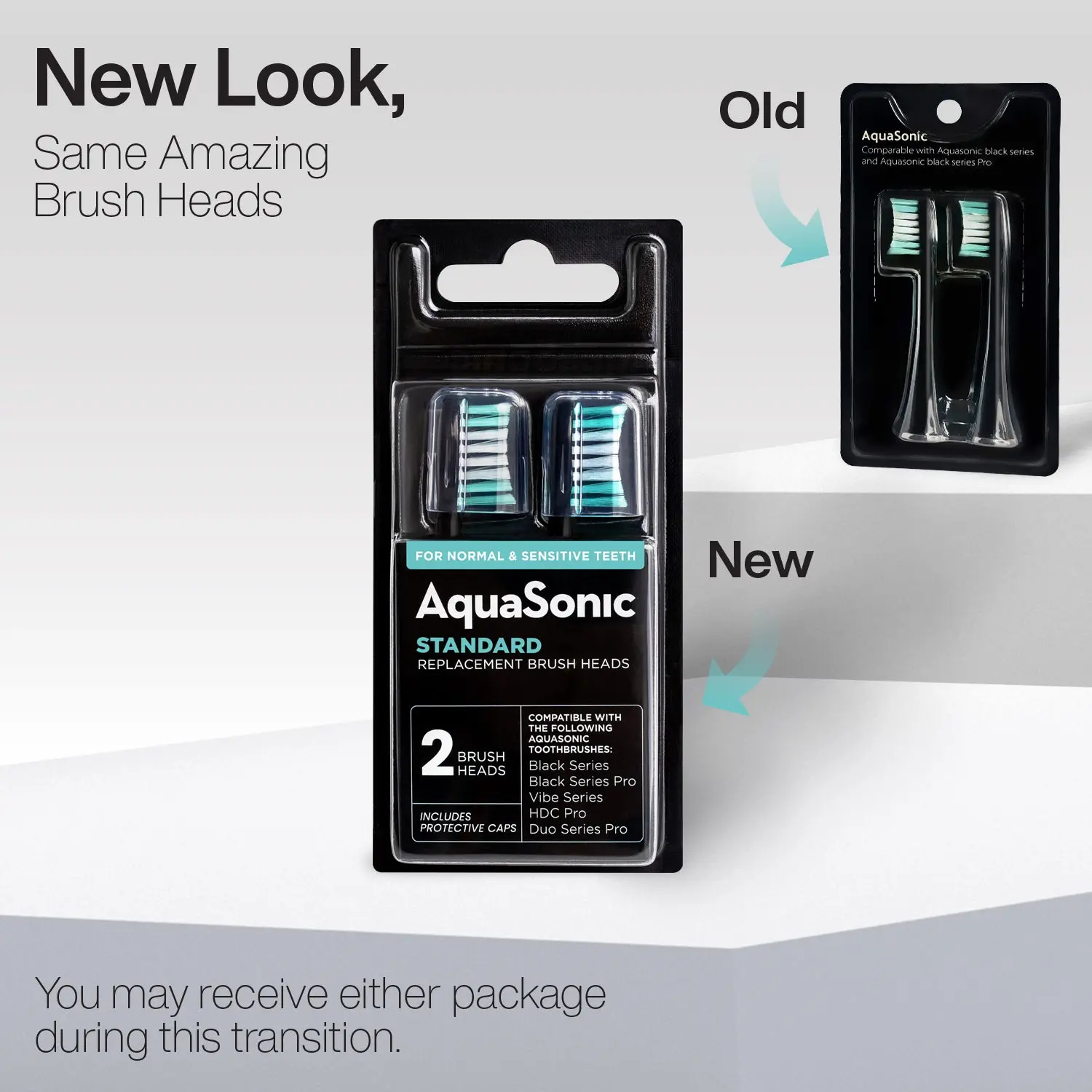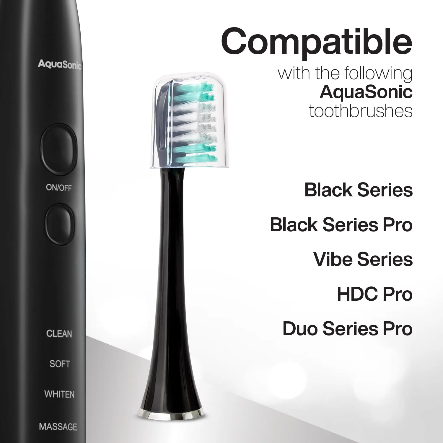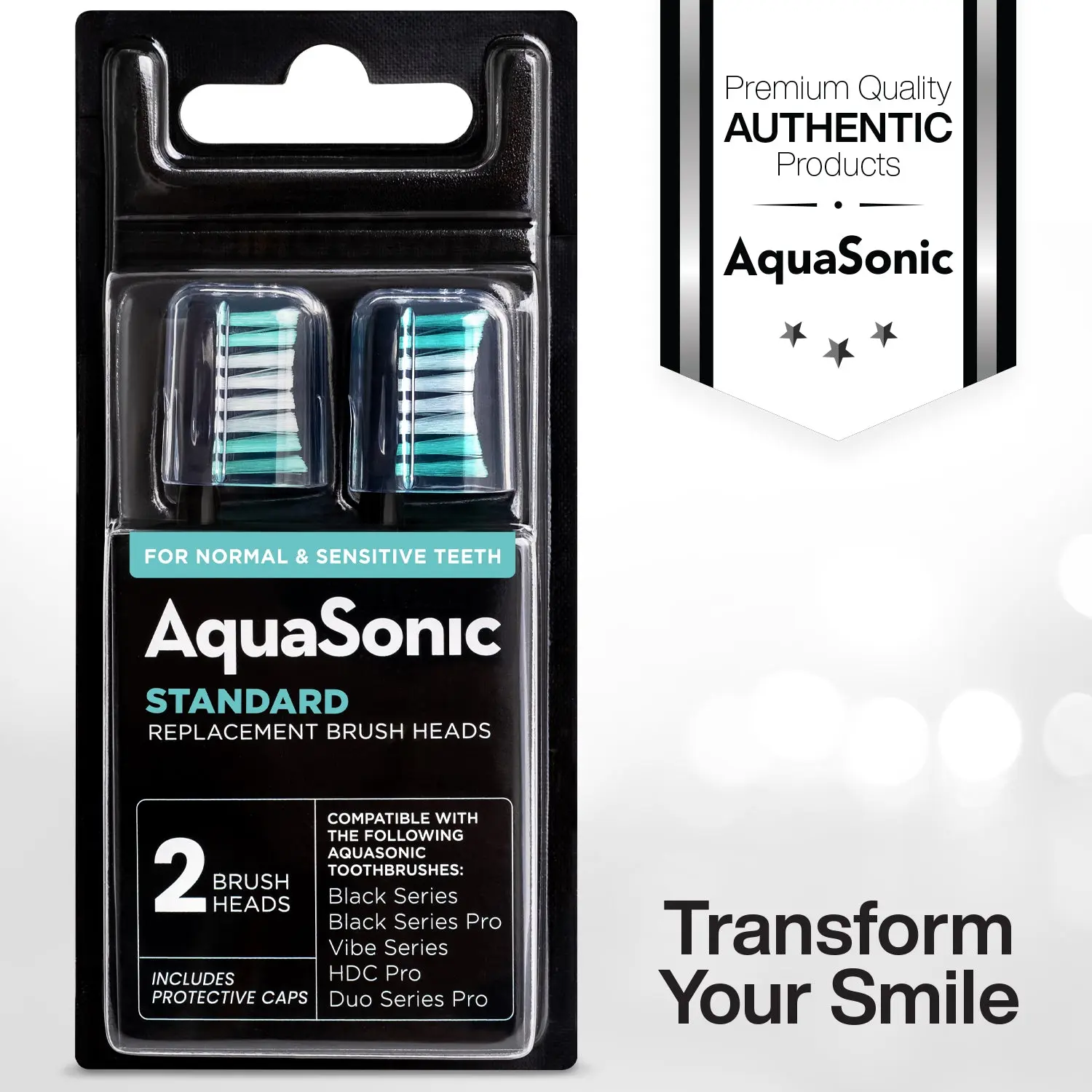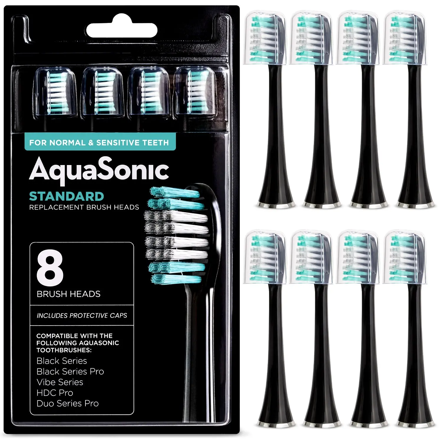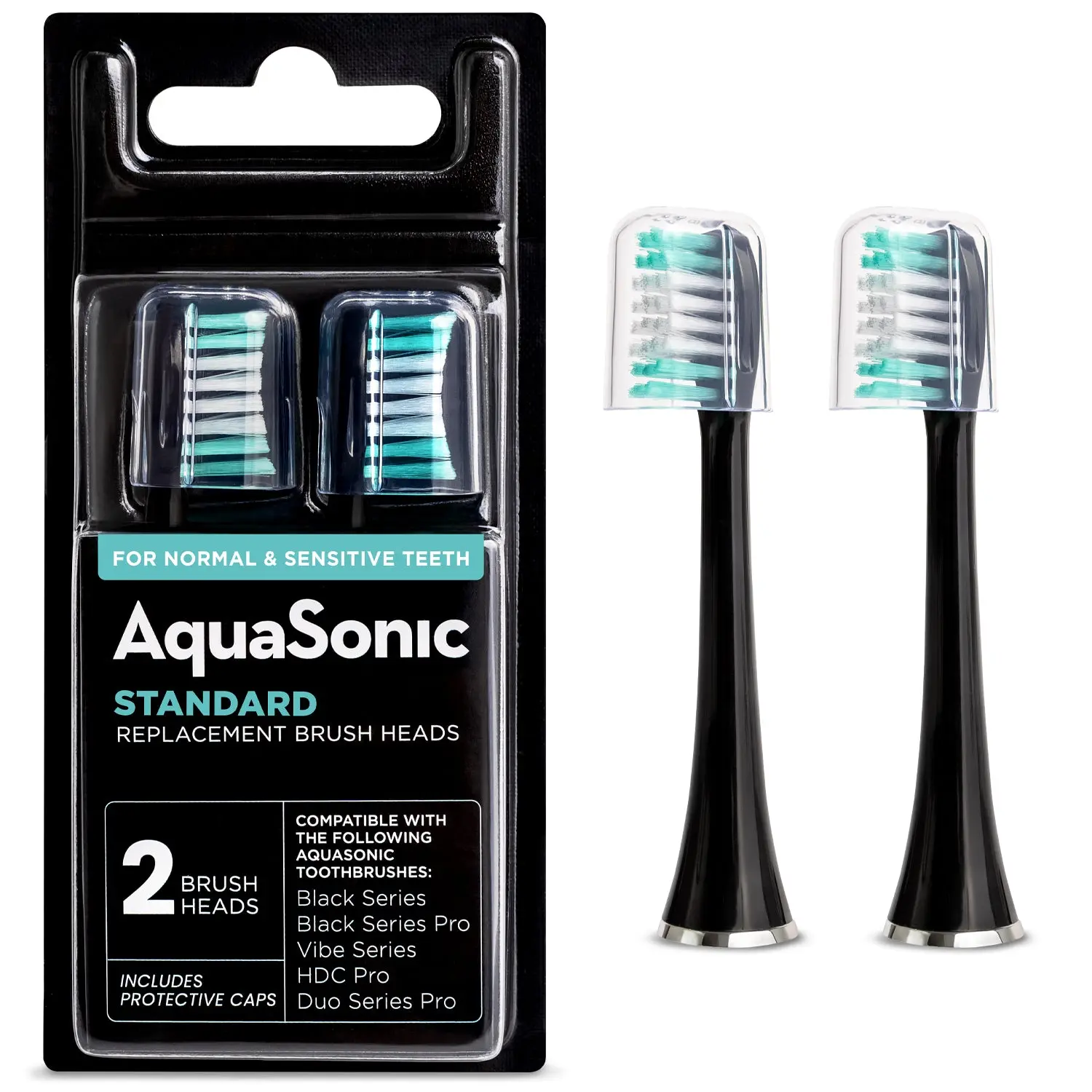 ·REPLACEMENT BRUSH HEADS: Compatible with the following toothbrush handles: Black Series, Black Series Pro, Vibe Series, HDC Pro, Duo Series Pro & Elite. Get the best performance out of your AquaSonic toothbrush by choosing authentic AquaSonic replacement brush heads. These DuPont-engineered Standard brush heads are curved to contour to the tooth surface, while the tapered bristles effectively clean between teeth and along the gumline.