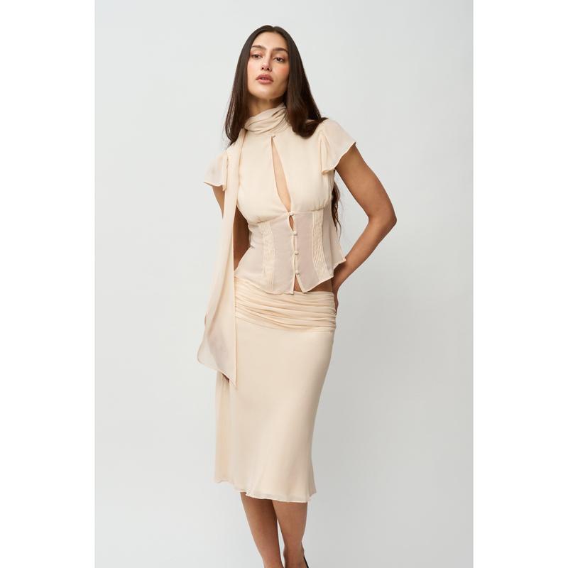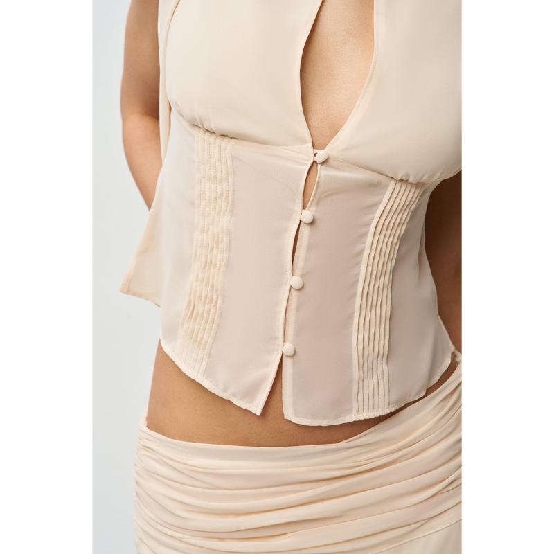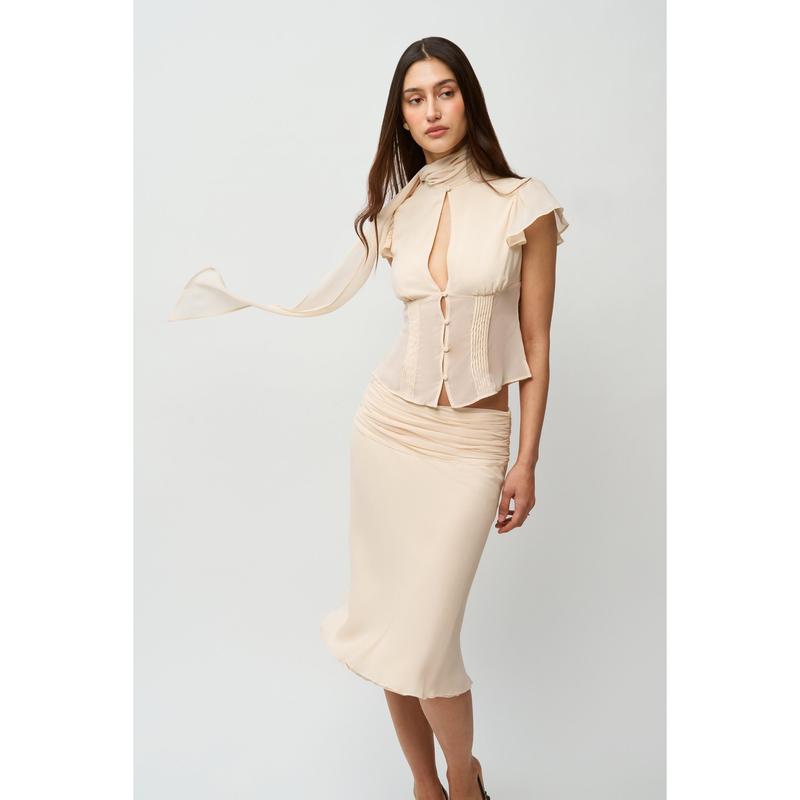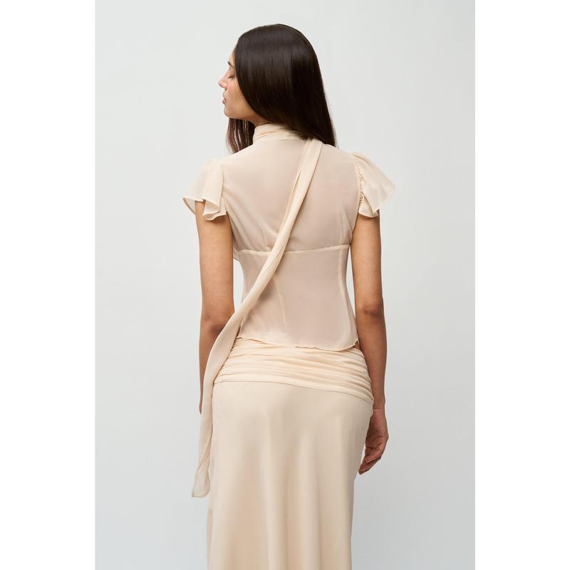 ·Meet your new favorite top: the Ara Top. Made of luxurious chiffon, its elegant design features a scarf detail, flutter sleeves, and a captivating keyhole center. The pleated bodice adds a touch of sophistication while functional buttons allow for a personalized fit. Pair with the Eda Skirt for a complete look!