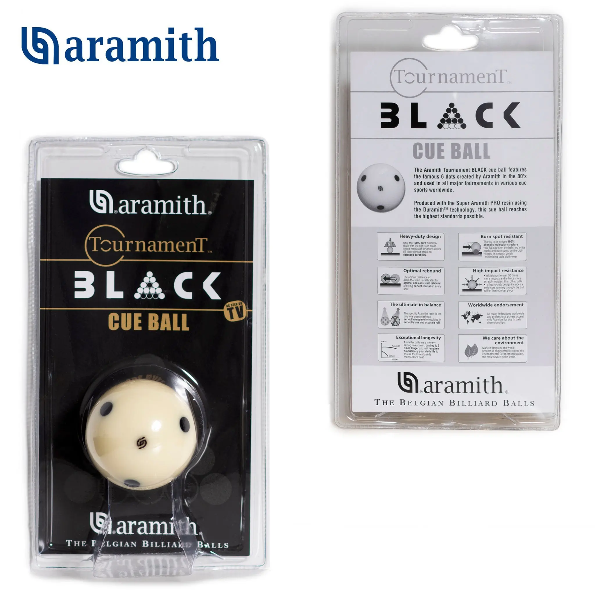 ·The Aramith Tournament BLACK cue ball features the famous 6 dots created by Aramith in the 80's and used in all major tournaments in various cue sports worldwide