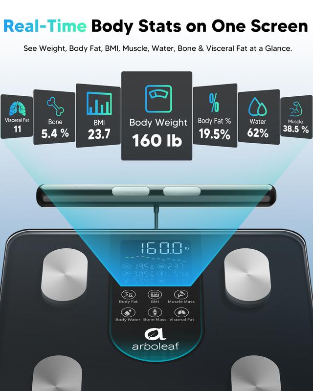 ·7-in-1 On-Scale Display for Instant Readings - The digital bathroom scale shows Weight, BMI, Body Fat, Muscle Mass, Body Water, Bone Mass and Visceral Fat on the screen. Check key metrics instantly without opening the app—perfect for quick daily use