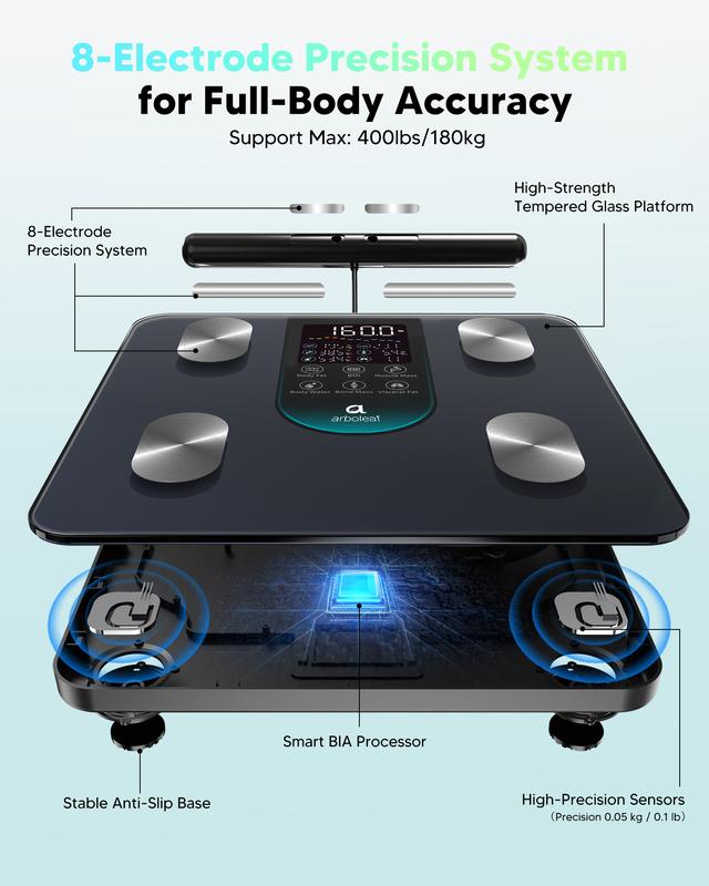 ·Dual-Frequency 8-Electrode Smart Scale for Full-Body Accuracy - This scale for body weight uses an 8-electrode system with dual-frequency BIA, giving more accurate body composition scale measurement compared to standard bathroom or digital scales