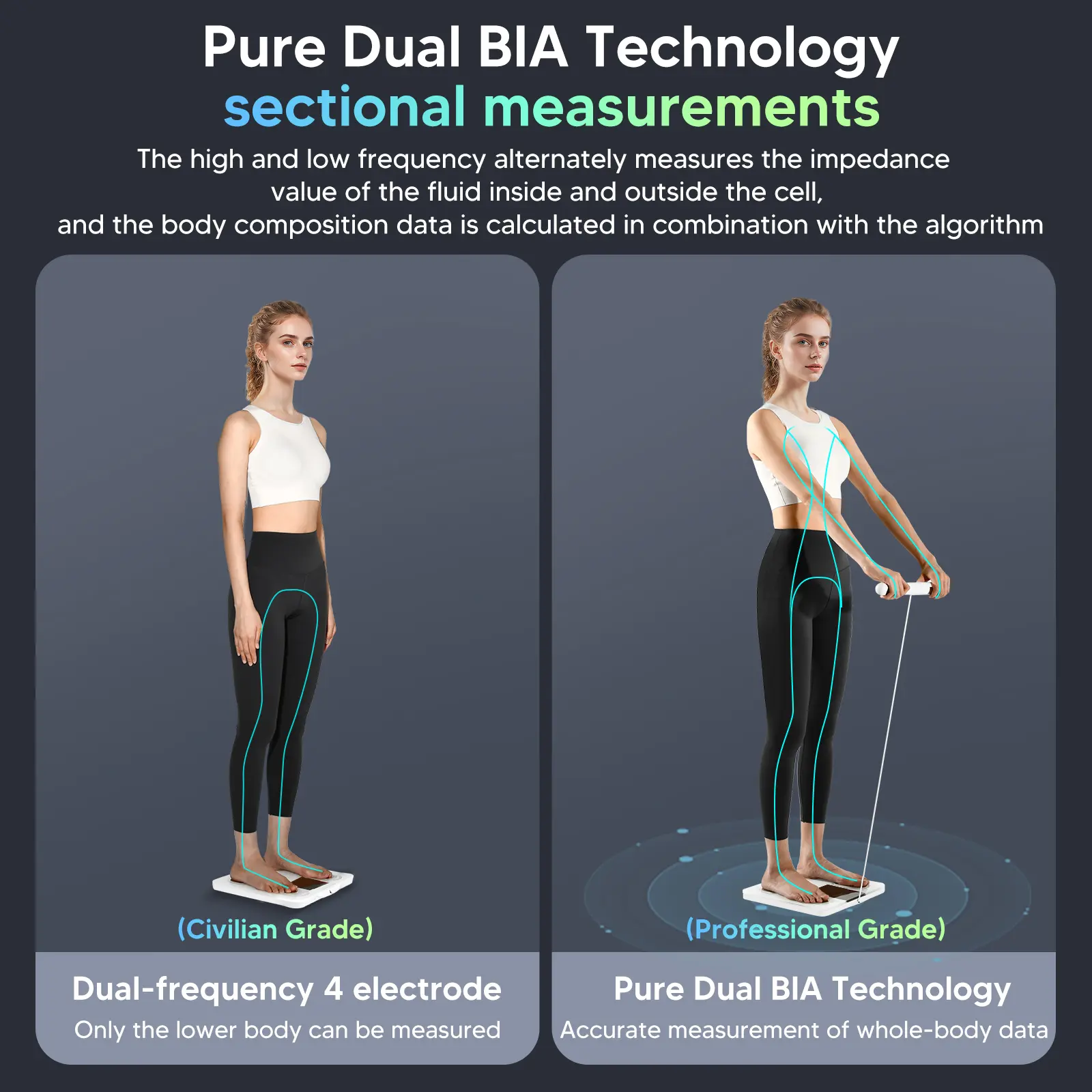 ·8-Electrode Technology: Measures 26 essential body metrics including weight, BMI, body fat, fat-free mass, subcutaneous fat, visceral fat, water percentage, muscle mass, bone mass, protein, BMR, and body age.