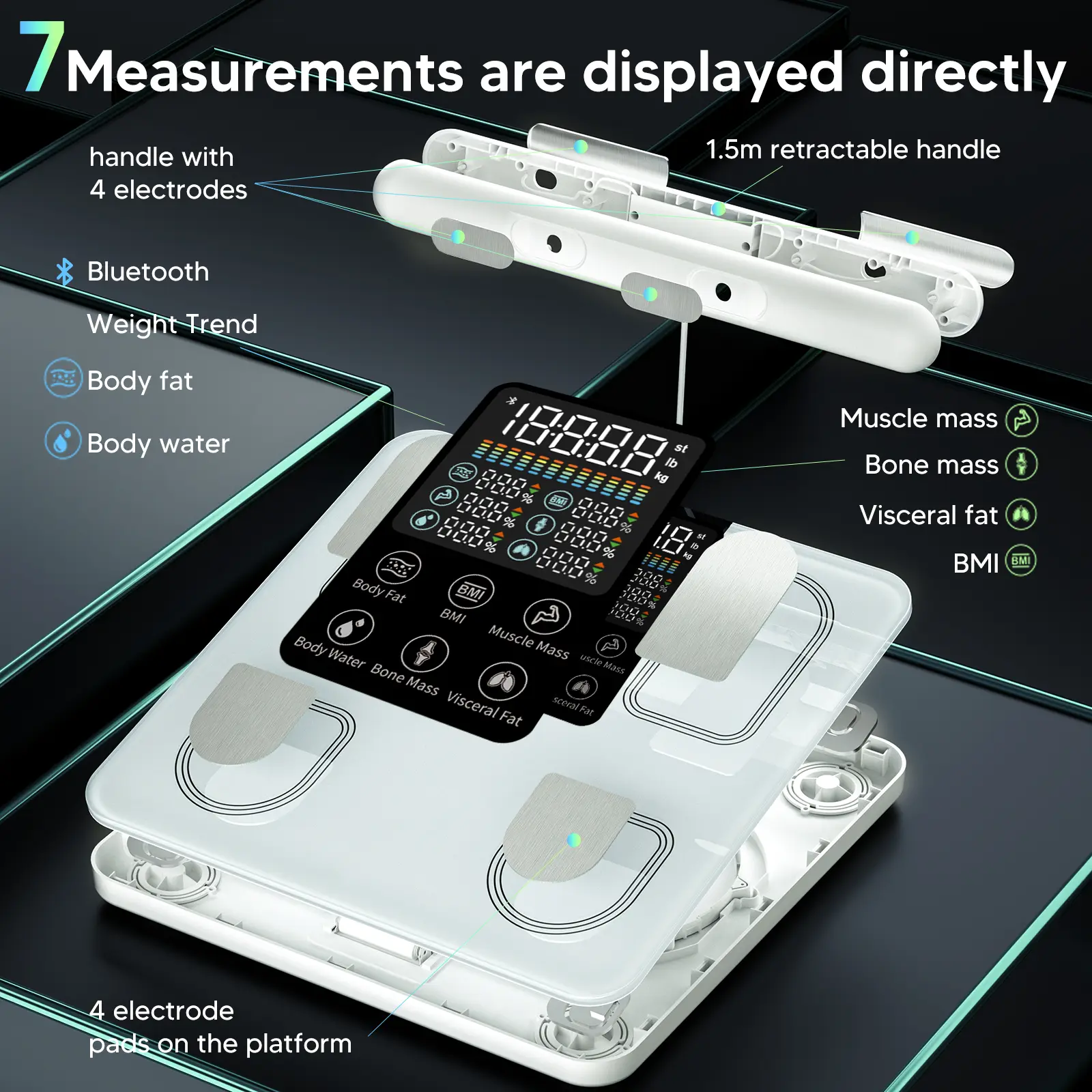 Usage Instructions:1. First-time Use: Install batteries and place the scale on a clean, stable surface. Wait until the scale displays 0.0kg before weighing.2. After Measurement: Replace the handle and view the full measurement report in the app.