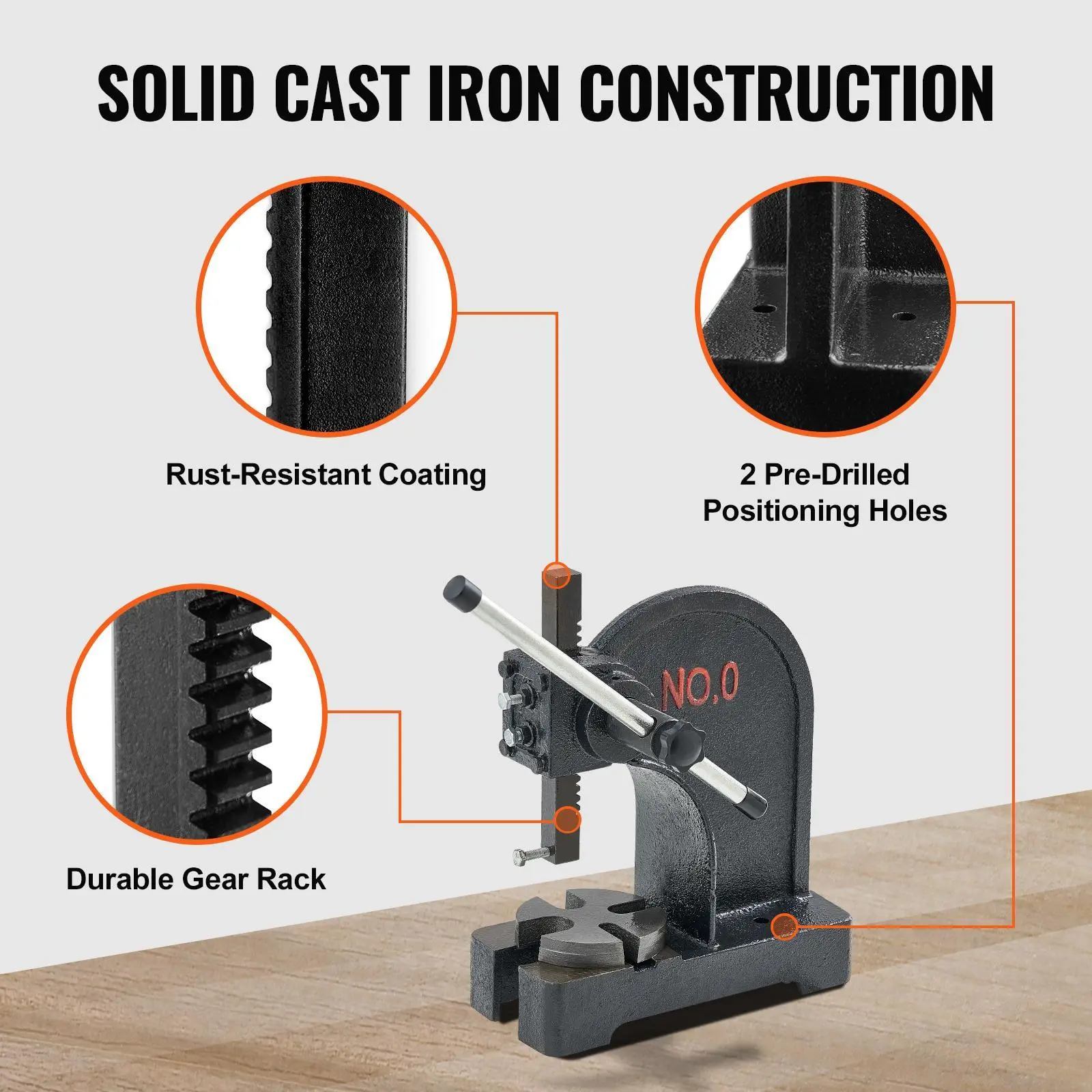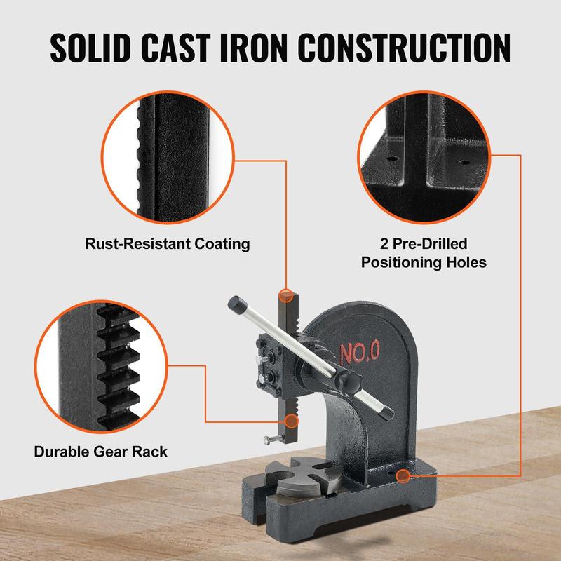 • Durable Construction: Crafted from high-strength cast iron, this manual arbor press is designed for long-term use without deformation or fracture. The overall anti-rust coating protects against corrosion, and the anvil plate is polished to ensure safety with no sharp edges.