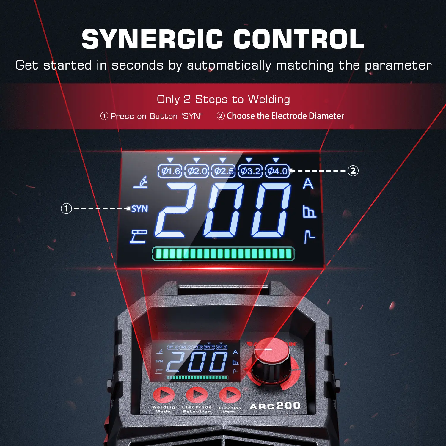 ·Synergic Control: Only 2 steps to start your welding journey. Step 1: Press the button "SYN. Step 2: Choose the electrode diameter.