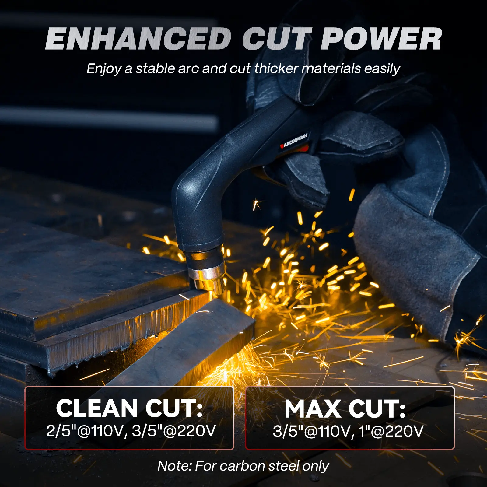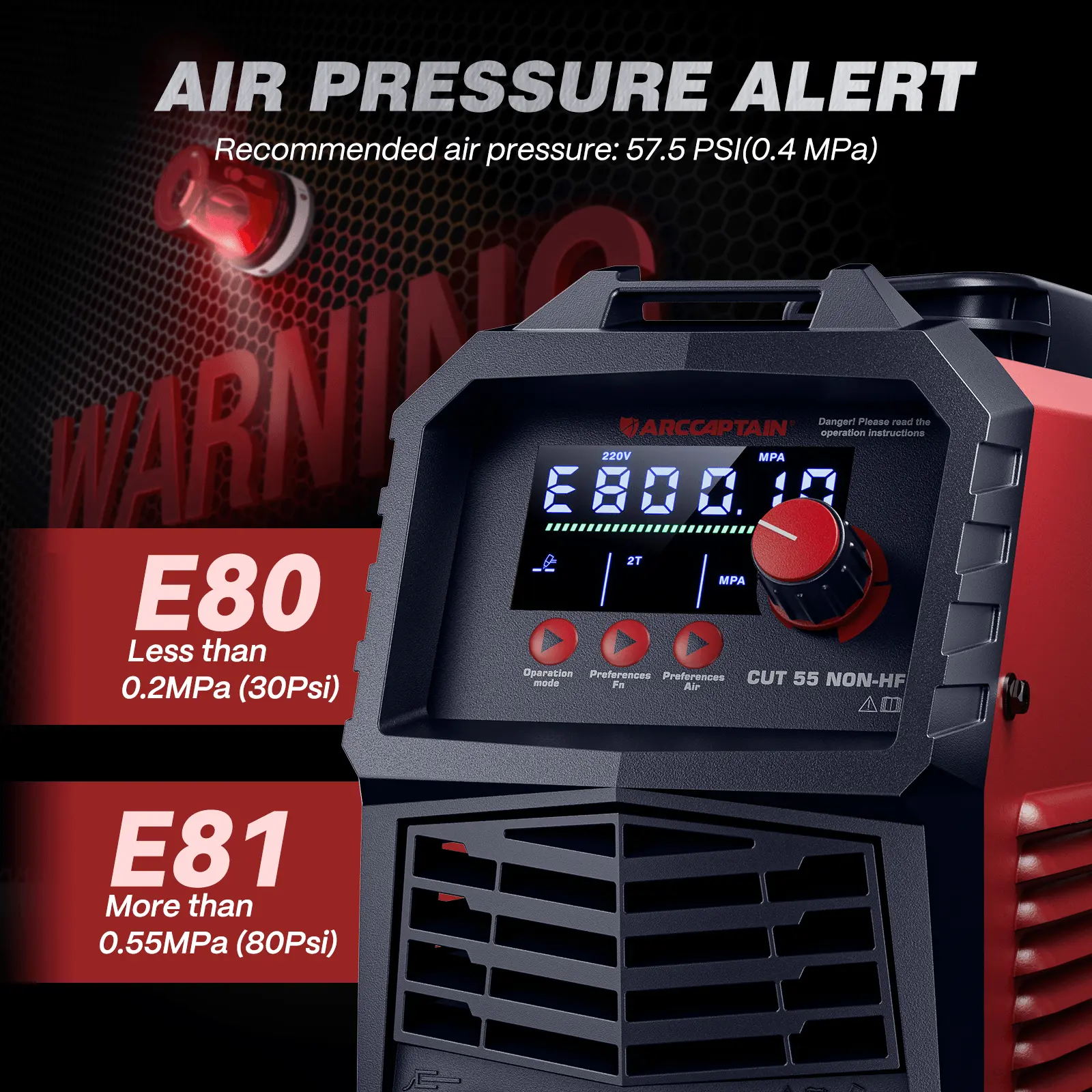 The ARCCAPTAIN CUT55 NON-HF is a smart, non-high-frequency plasma cutter built for modern metalwork. Featuring a large LED screen, intelligent air pressure detection, and full mode support like 2T/4T and PA/PT, its Ideal clean cut thickness up to 18mm (11/16"), max severance up to 26mm (1").