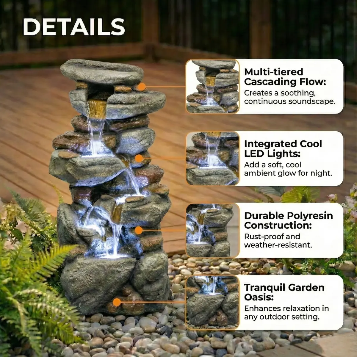 ·Relaxing Water Flow: Enjoy the soothing water flow as it cascades down each layer, mimicking the sound of a real waterfall and adding a tranquil ambiance to your outdoor environment.The six white lights on the rockery outdoor waterfall fountain cast a soft and cozy glow, enhancing the overall atmosphere with a radiant charm.