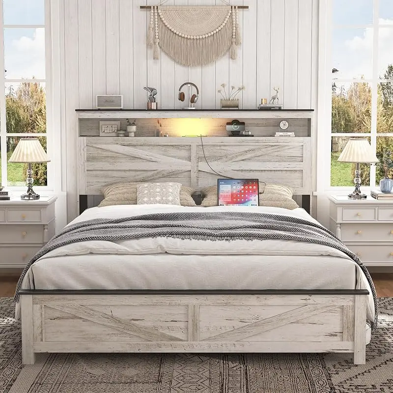 ARCH Queen Bed Frame Farmhouse, Queen Size Bed Frame with Storage Headboard & LED Lights, Charging Station Boho Platform Bed, Queen Bed Frame Metal Slats No Box Spring Needed Bedroom Set