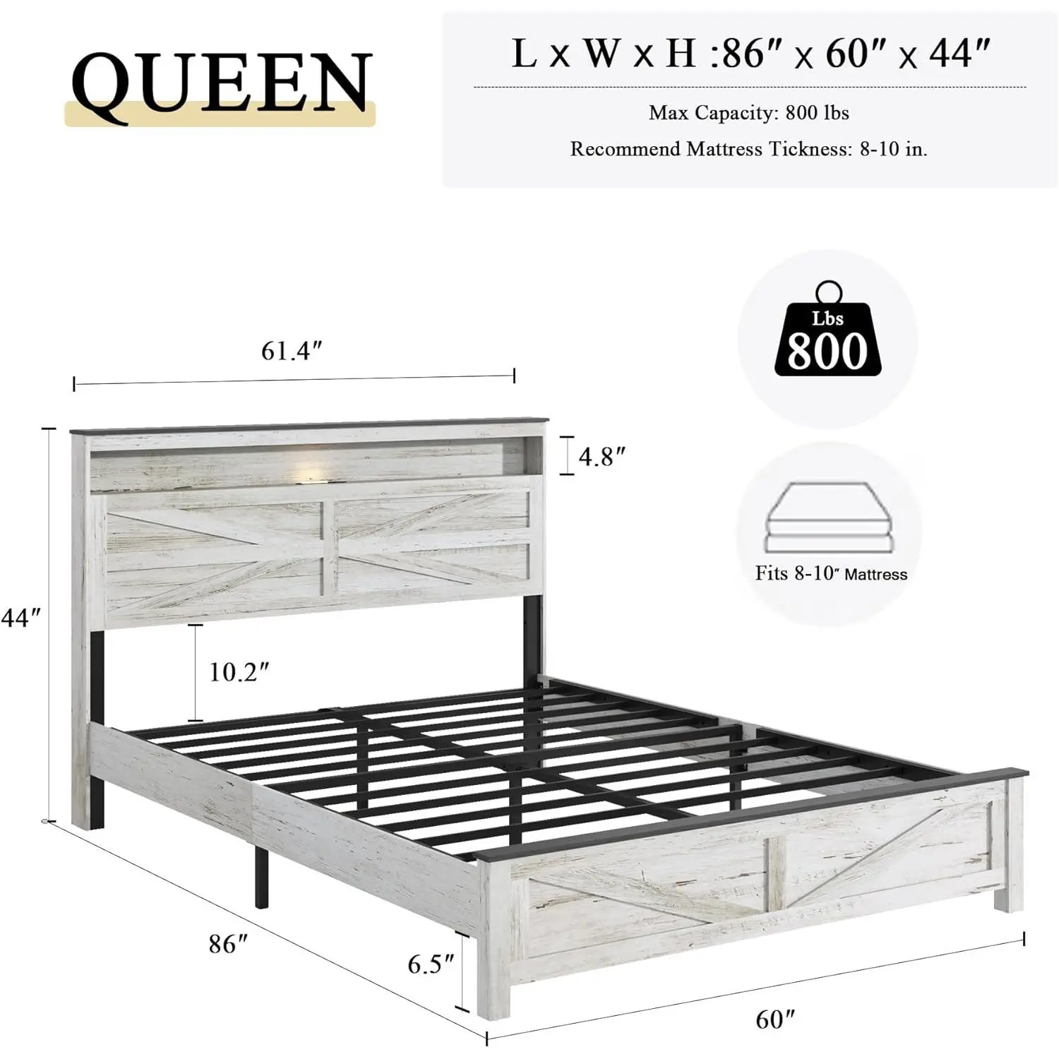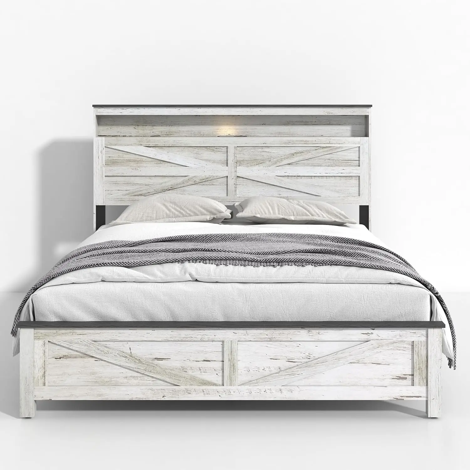 The ARCH Queen Bed Frame Farmhouse is a premium queen size platform bed made of high-quality MDF and heavy-duty metal. It offers a rustic, charming, and cozy bedroom retreat with additional storage and convenience features.