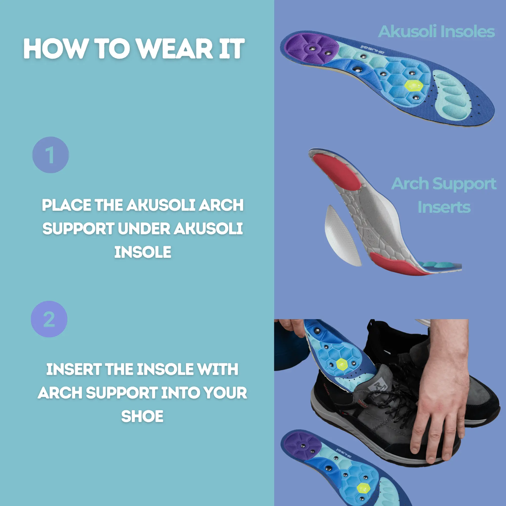 Designed for a seamless fit with Akusoli insoles, these arch supports provide enhanced comfort, stability, and perfect foot alignment. Together, they reduce pressure, improve posture, and deliver all-day relief for every step.