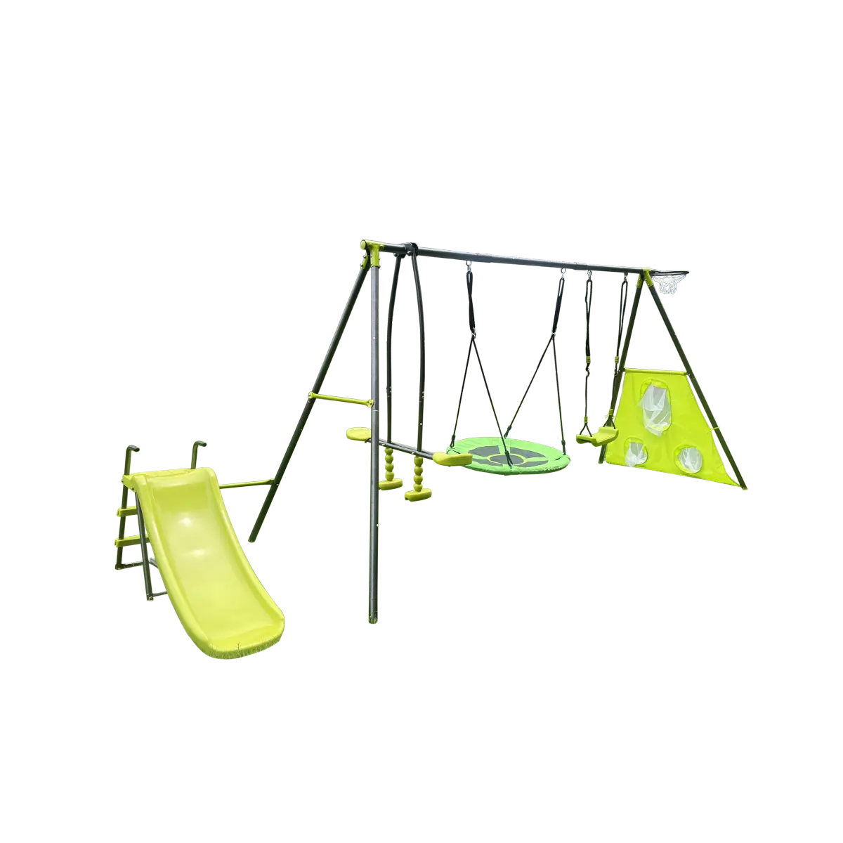 ·This swing set integrates multiple play elements-including traditional swings, a round saucer swing, a slide, a climbing wall, and a basketball hoop-providing kids with a comprehensive outdoor play experience that combines swinging, sliding, climbing, and sports fun.