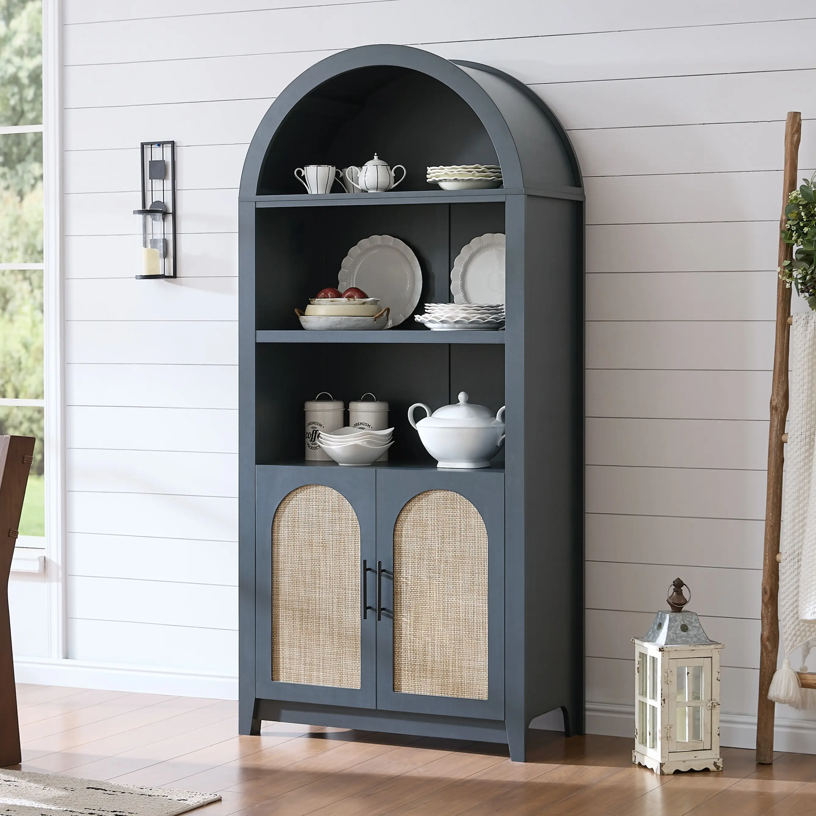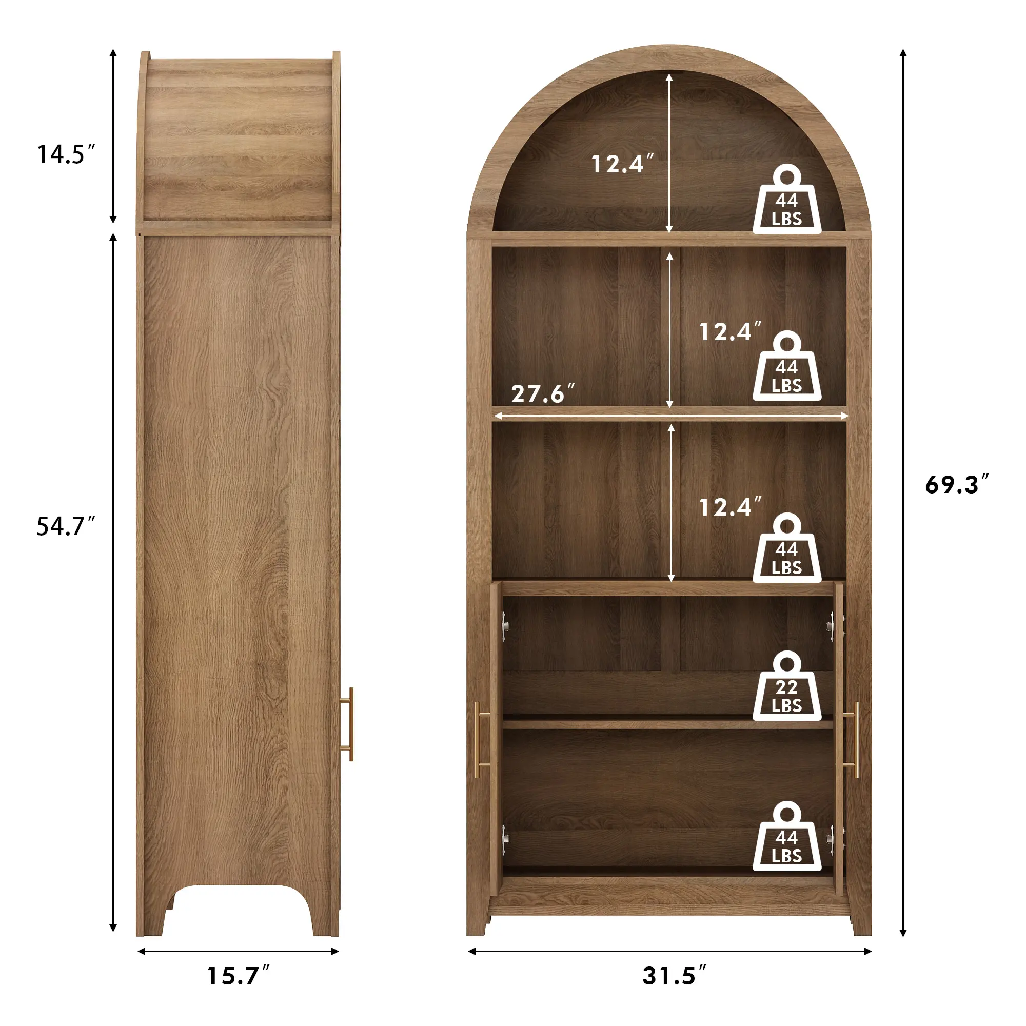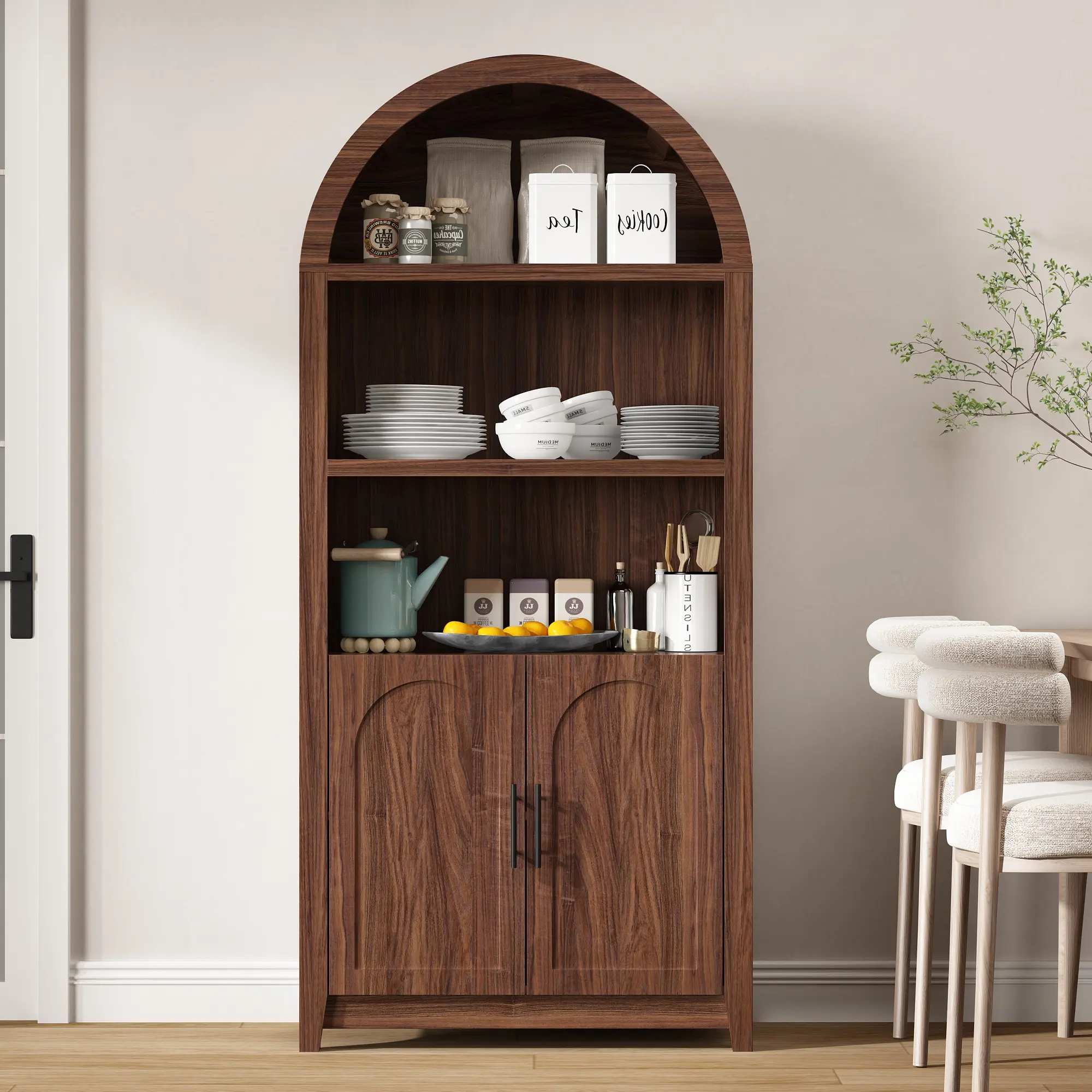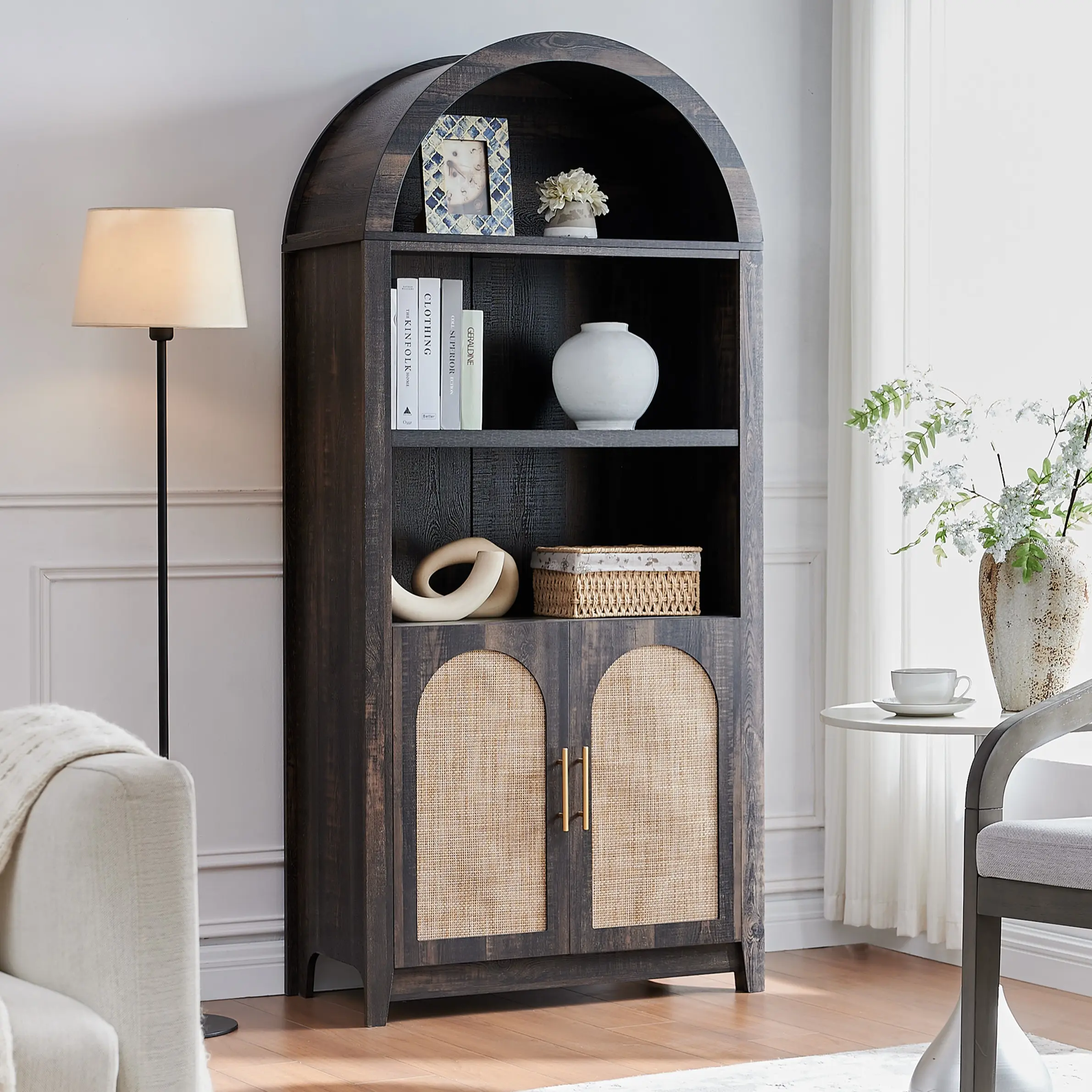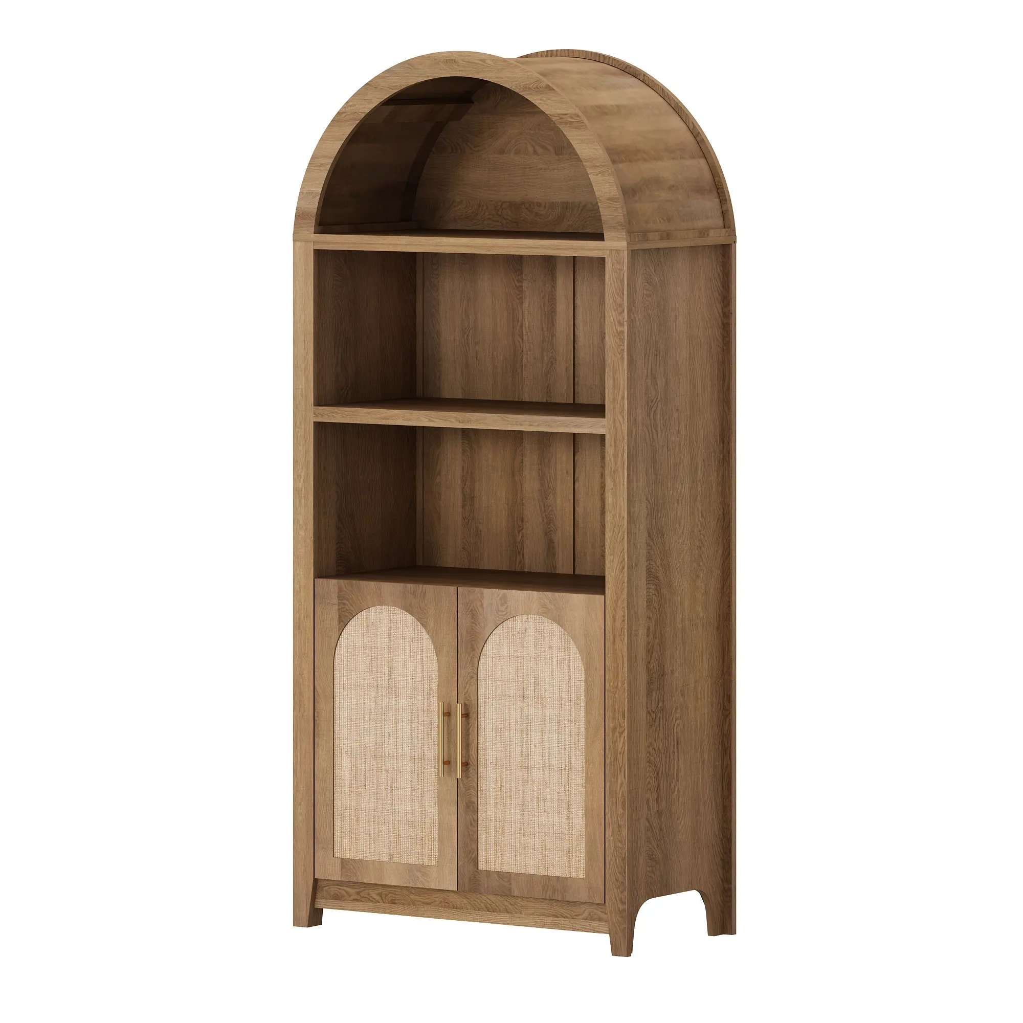 ·Elegant Arch- This beautifully arched bookcase combines modern sophistication with the natural warmth of walnut-tone doors. Its gracefully curved arch sets it apart from standard designs, adding a unique and refined touch to any space. Whether in the living room, office, or kitchen, this versatile piece enhances your decor while providing functional, stylish storage.