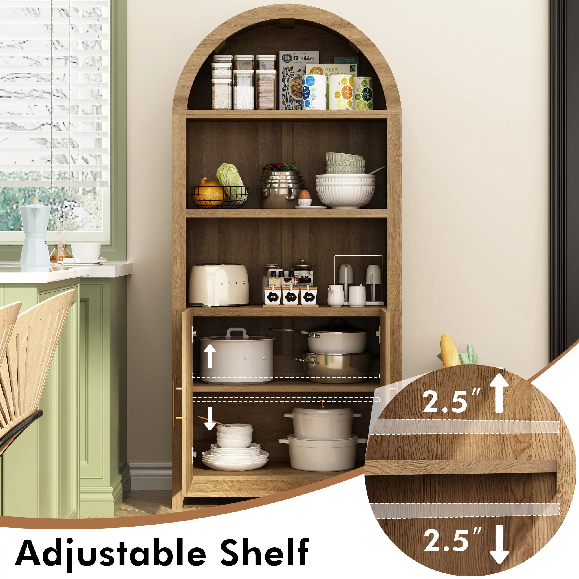 ·Spacious & Customizable Storage - With five roomy tiers, this bookcase offers ample space for books, decor, and essentials. Adjustable shelves allow you to arrange items of various sizes, maintaining a well-organized and visually appealing look. The dual arched walnut-tone doors lend elegance and protect your items from dust, blending function and style seamlessly.