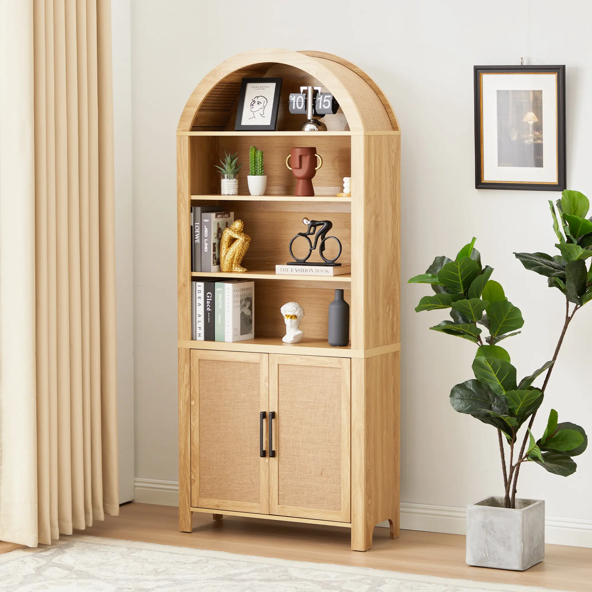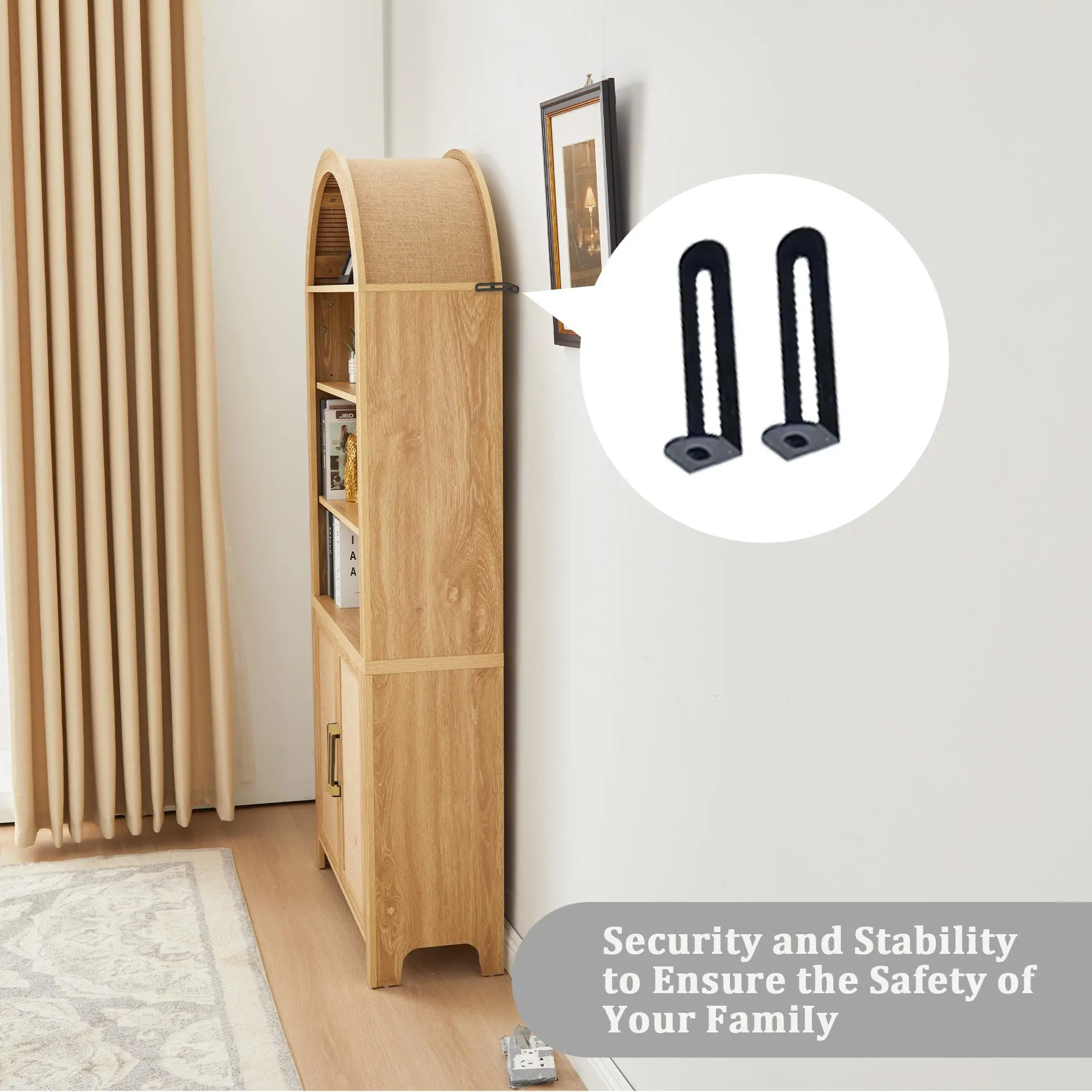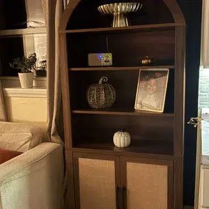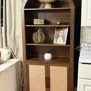 ·【Versatile Storage Solution】 This arched storage cabinet offers a functional and stylish solution for various needs. The lower section includes an openable 2-door cabinet with metal handles and adjustable shelves, ideal for storing kitchen essentials, office supplies, or personal items. The upper part boasts a 4-layer open arched bookshelf, with the middle 2 layers featuring adjustable shelves that can each hold up to 44 pounds