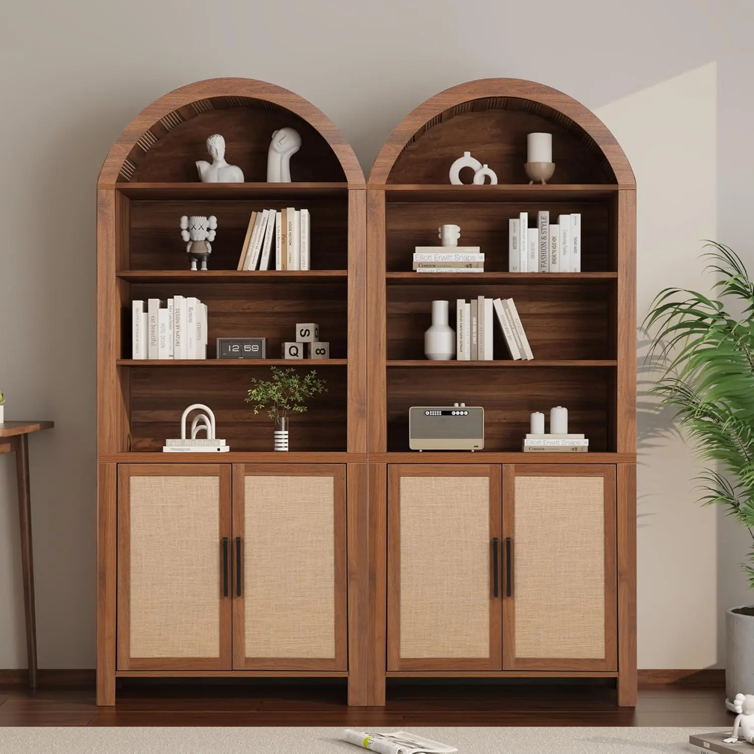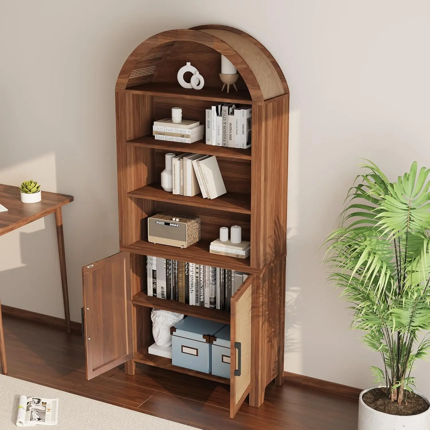 Open Display Arched Bookshelf with 2 Doors and Adjustable Shelves