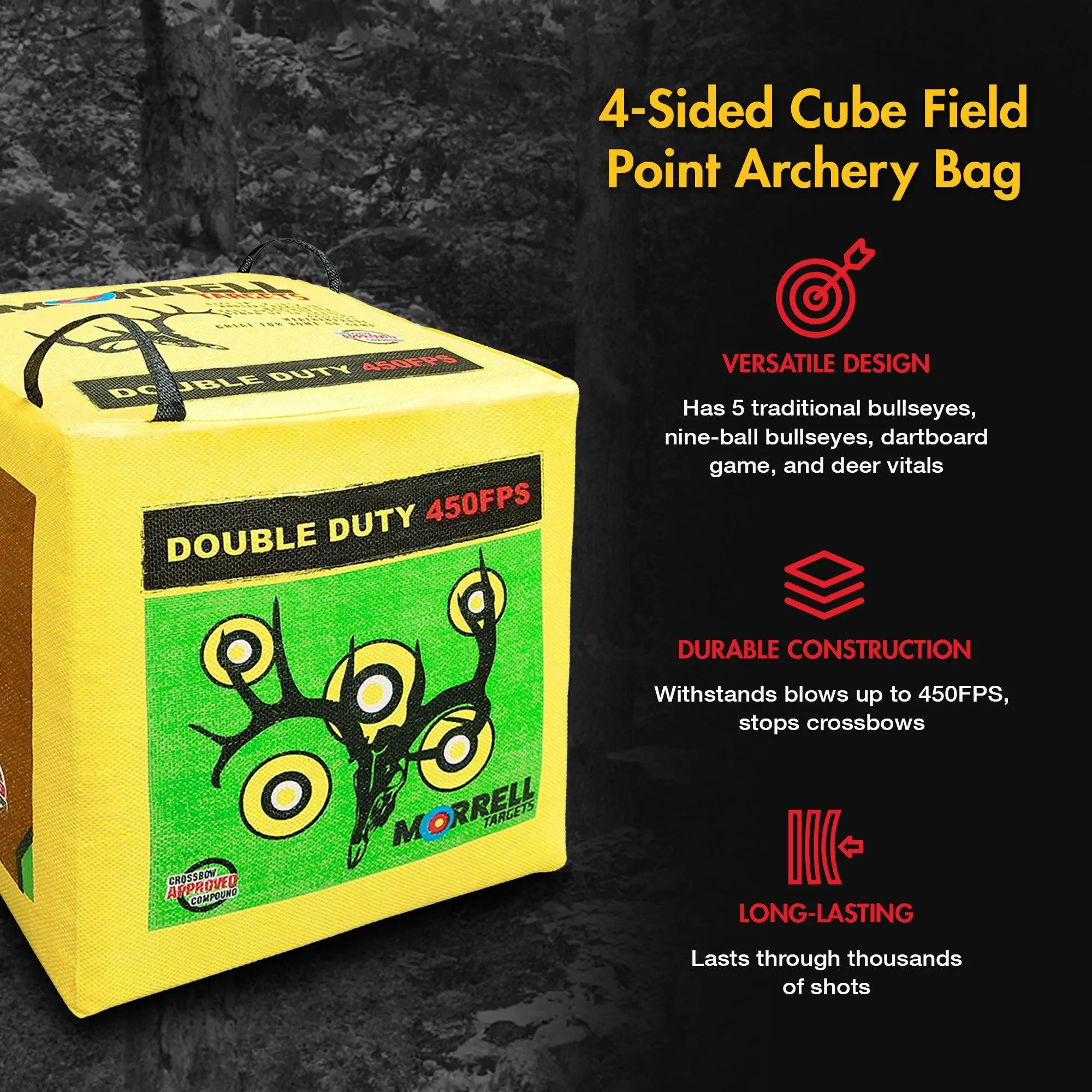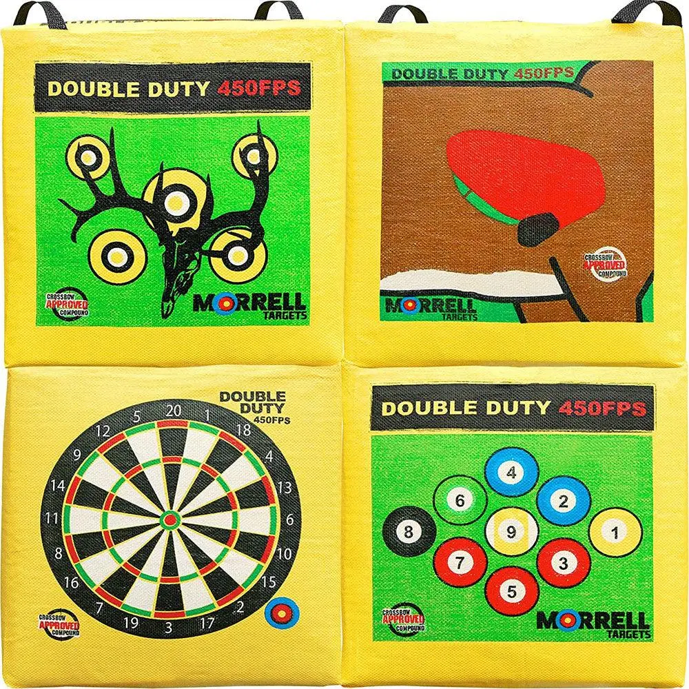 The Morrell Double Duty 4-Sided Cube Archery Target offers versatile practice with 5 traditional bullseyes, 9-ball bullseyes, dartboard, and deer vitals on four sides. It’s designed for crossbows, compound bows, and air bows, stopping up to 450 FPS. Features include an E-Z carry handle, easy arrow removal, and durable construction, making it perfect for outdoor practice and family fun.