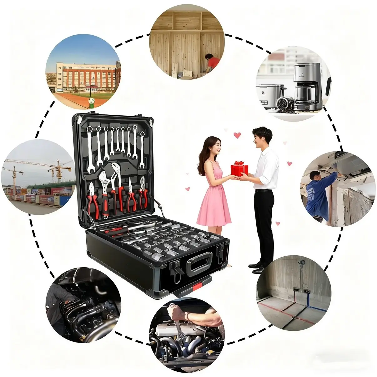 ·Portable Tool Box The Household Hand Tool Set is a trolley case which made of aluminum alloy;Tool sets looks like a suitcase and can be pulled anywhere freely; Is a good choice for Valentine's Day gifts;;Note! If you receive a damaged product, please contact us in time, it may be that the product is damaged during transportation, we will solve your problem at any time