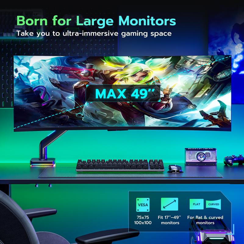 ·【Fits Most 17–49” Monitors】Supports flat and curved screens up to 49" and 44 lbs, like Samsung Odyssey G9 and LG ultrawide. Comes with 75x75mm and 100x100mm VESA mounts. (VESA adapter needed if your monitor has no mounting holes.)