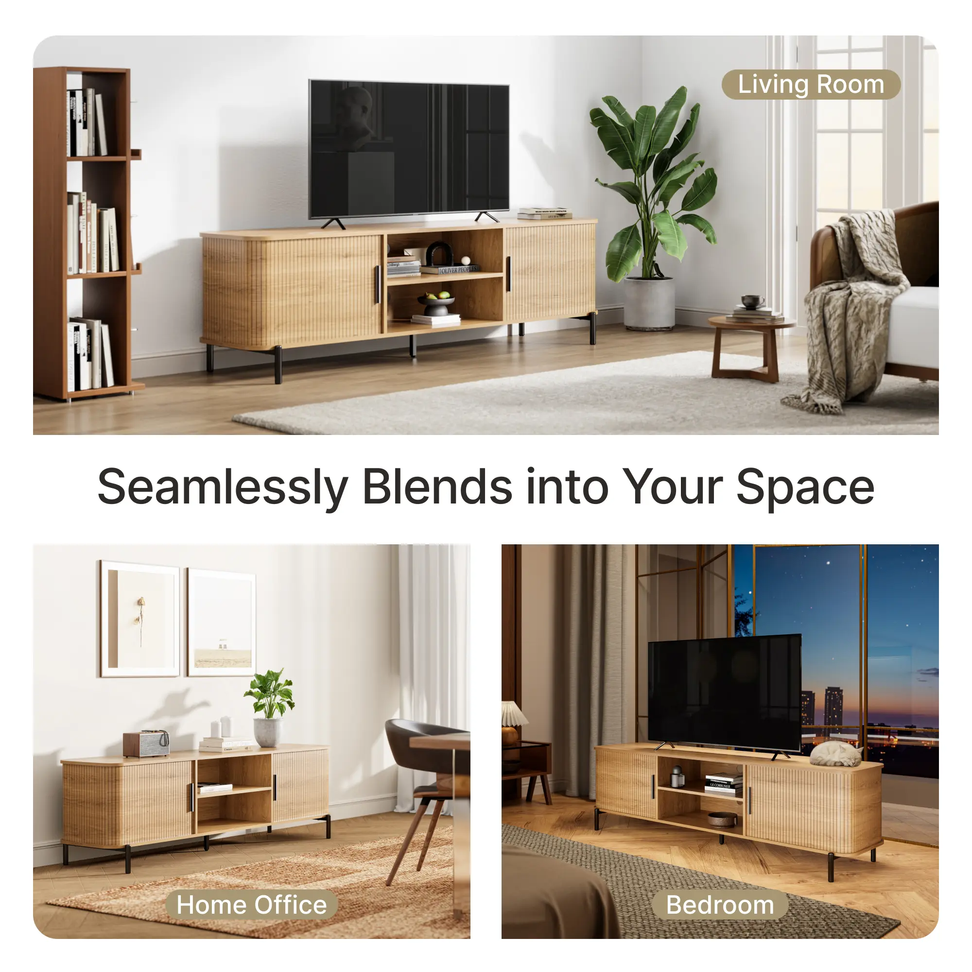 【Versatile Modern Design】 With its smooth-sliding tambour doors and elegant fluted wood design, this TV stand adds warmth and sophistication to any space. The natural wood finish paired with black metal legs and handles creates a refined contrast, making it a stylish TV console table that blends seamlessly with mid-century modern, Scandinavian, or modern organic living
