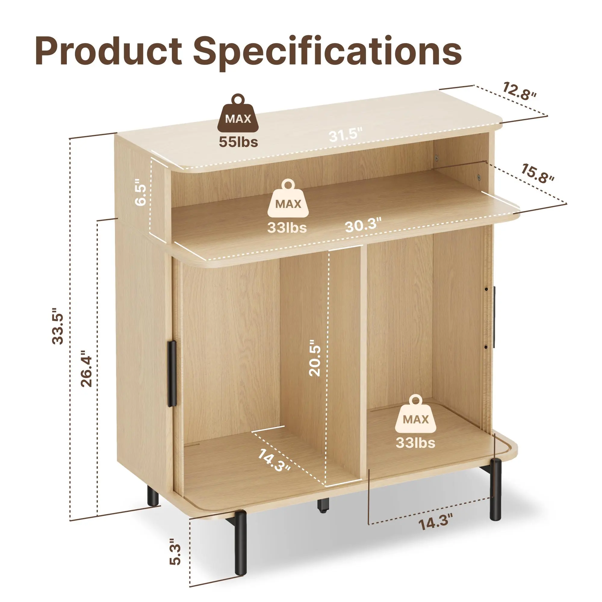 Keep everything organized! Two spacious compartments and a two-tier open shelf provide versatile storage. Hold up to 33 lbs inside each compartment and 55 lbs on top — perfect for kitchen appliances, decorative items, or even suitcases and laundry baskets.