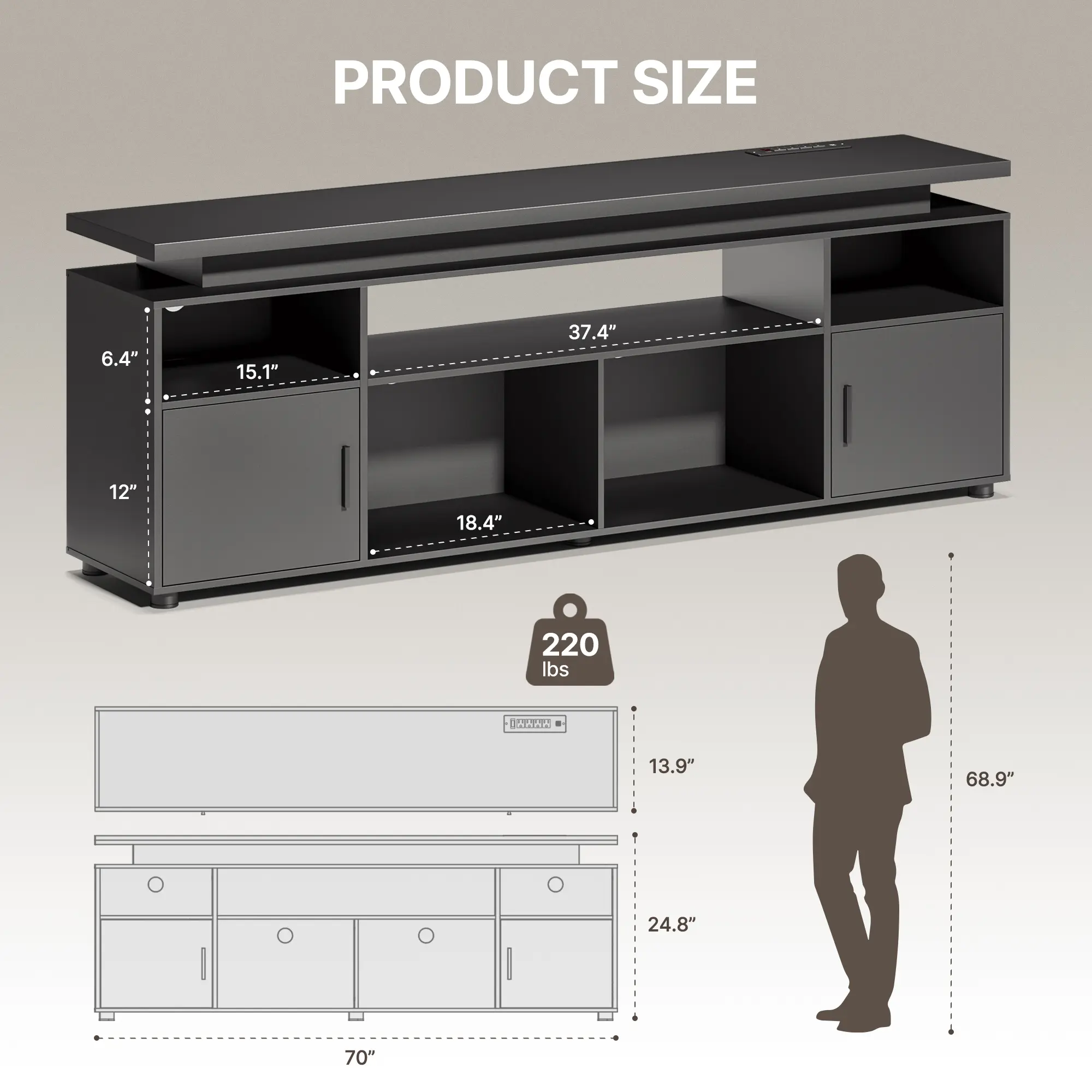 【Supports TVs up to 80 Inches】 This 70-inch modern TV stand with storage is designed to support a wide range of television sizes—including 60″, 65″, 70″, 75″, and up to 80″—providing a wide and stable base for your home theater setup. Perfect as a media console, TV cabinet, or entertainment center with storage, it combines function and style for your living room or bedroom, accommodating large screens and accessories with ease