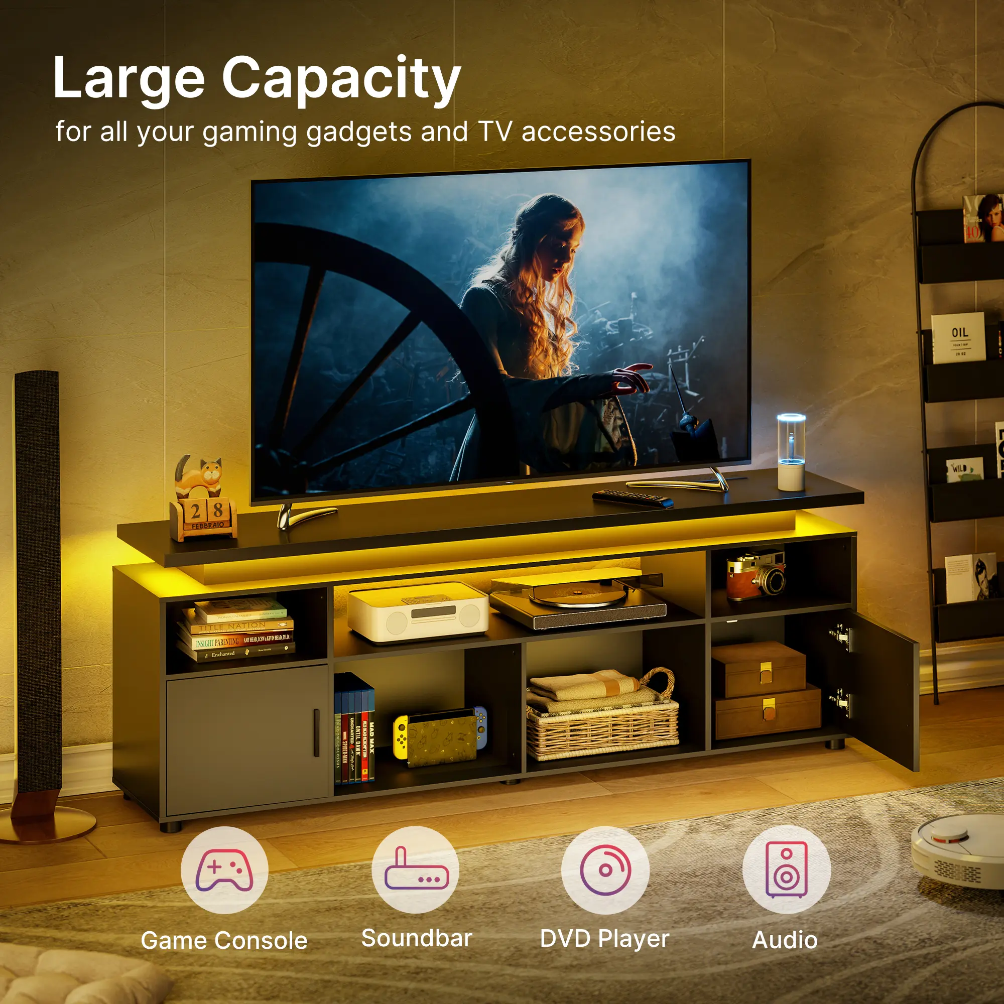 ·Elevate Your Entertainment Experience - Our entertainment TV stand enhances your space with LED light strips featuring 20 colors and 22 dynamic modes, creating a lively ambiance for movies or gaming. The included remote allows you to easily switch colors and modes from your sofa, customizing your experience with ease. Plus, the built-in power outlet makes connecting various devices simple, ensuring all your entertainment needs are met