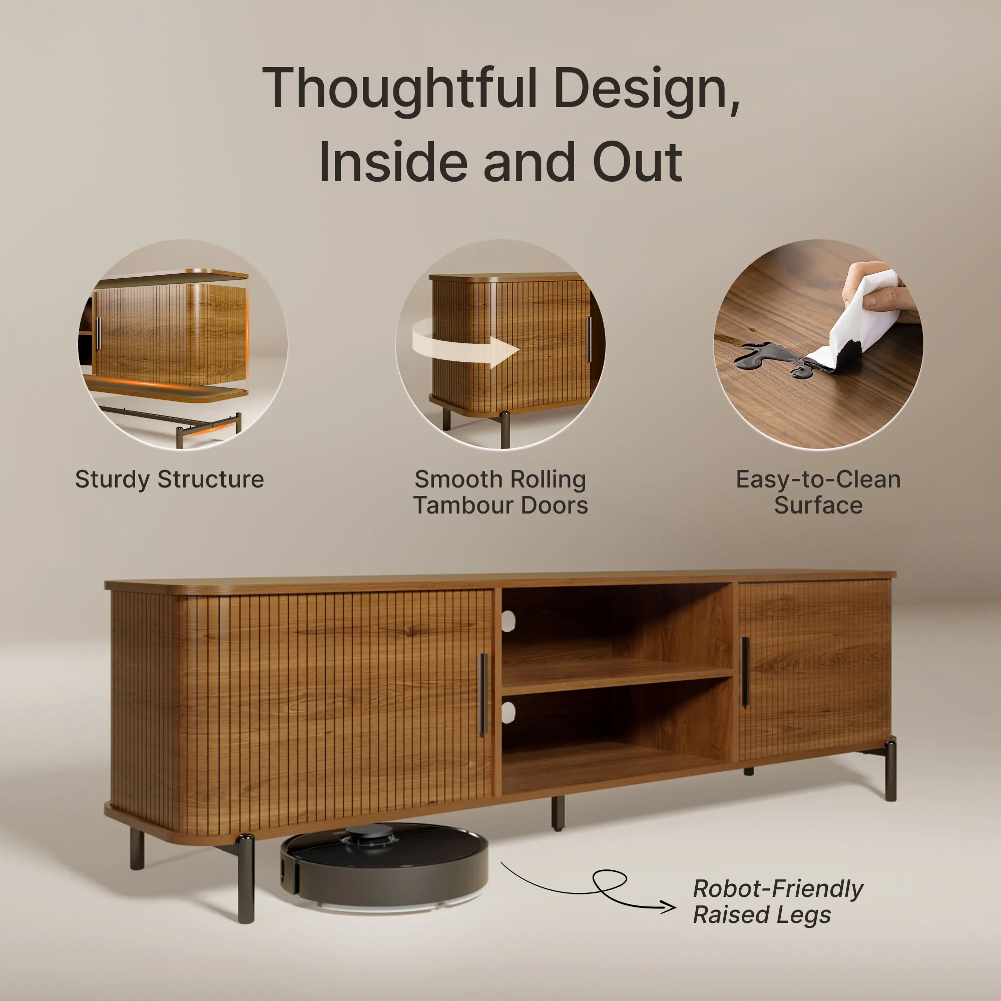 Built to last with a strong wood frame and reinforced metal legs. Bottom metal supports prevent tipping, keeping children and pets safe. Compact yet solid, this cabinet handles daily use without wobbling.