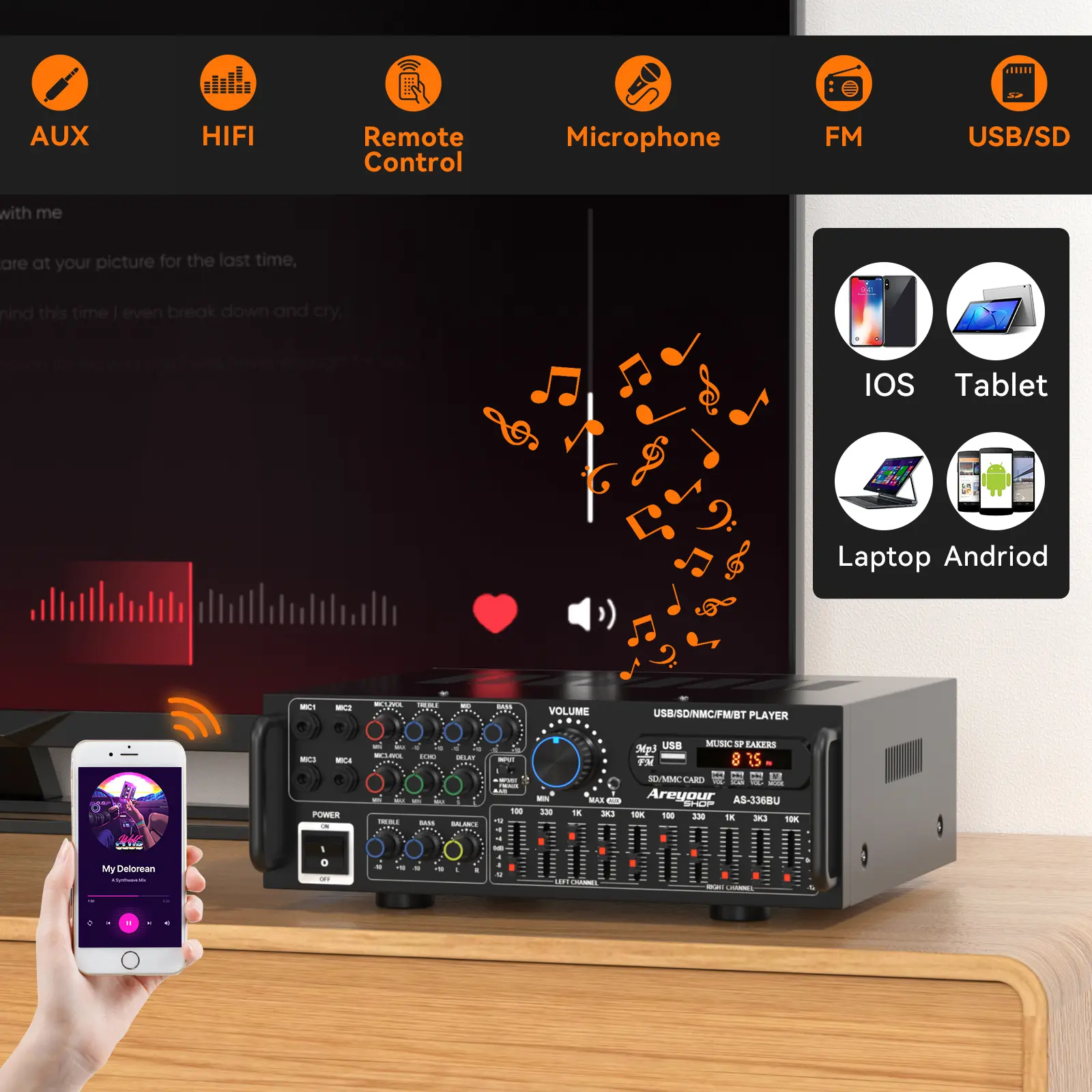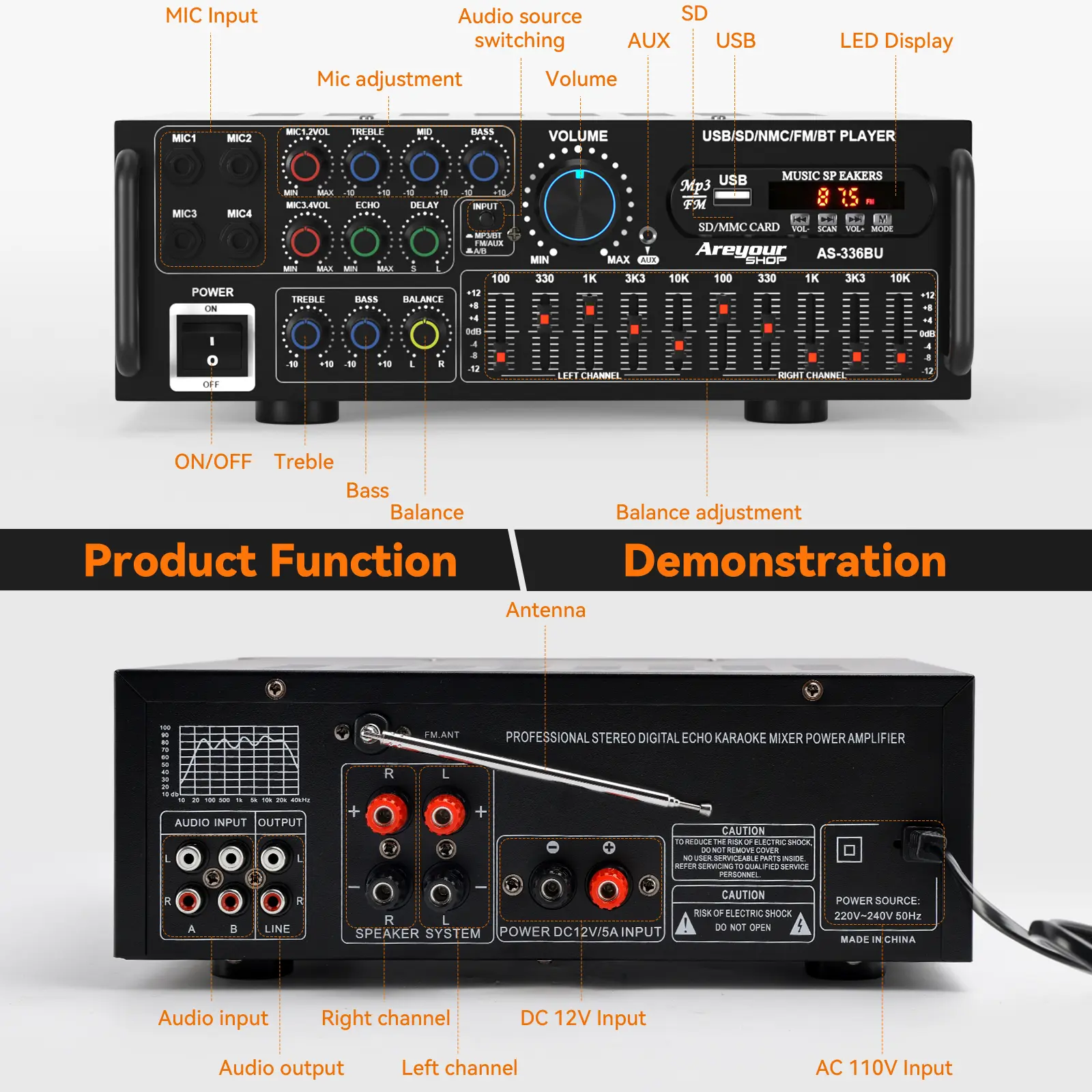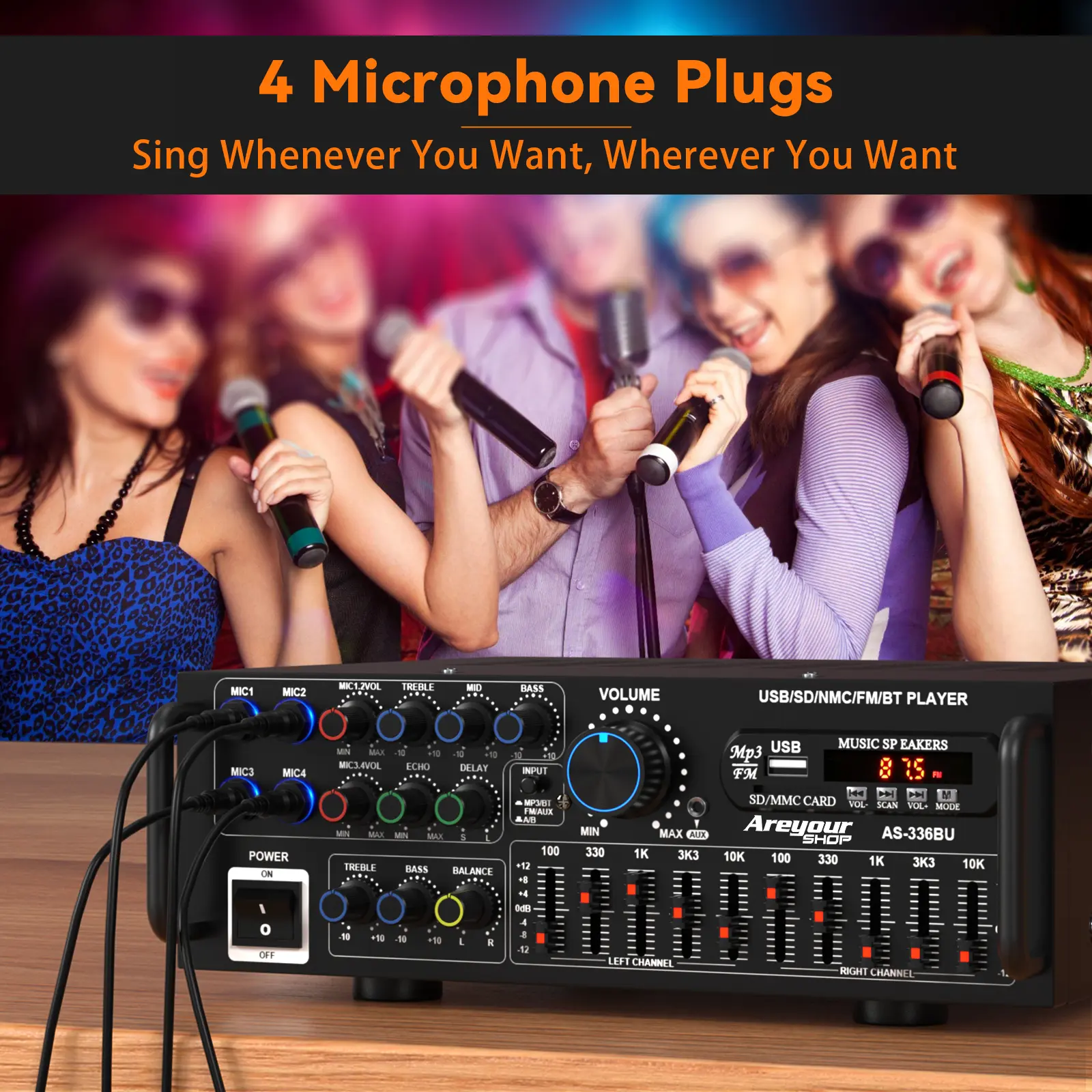 ·Multiple Connections: Bluetooth 5.0, FM radio, USB, SD card, 4 mic inputs