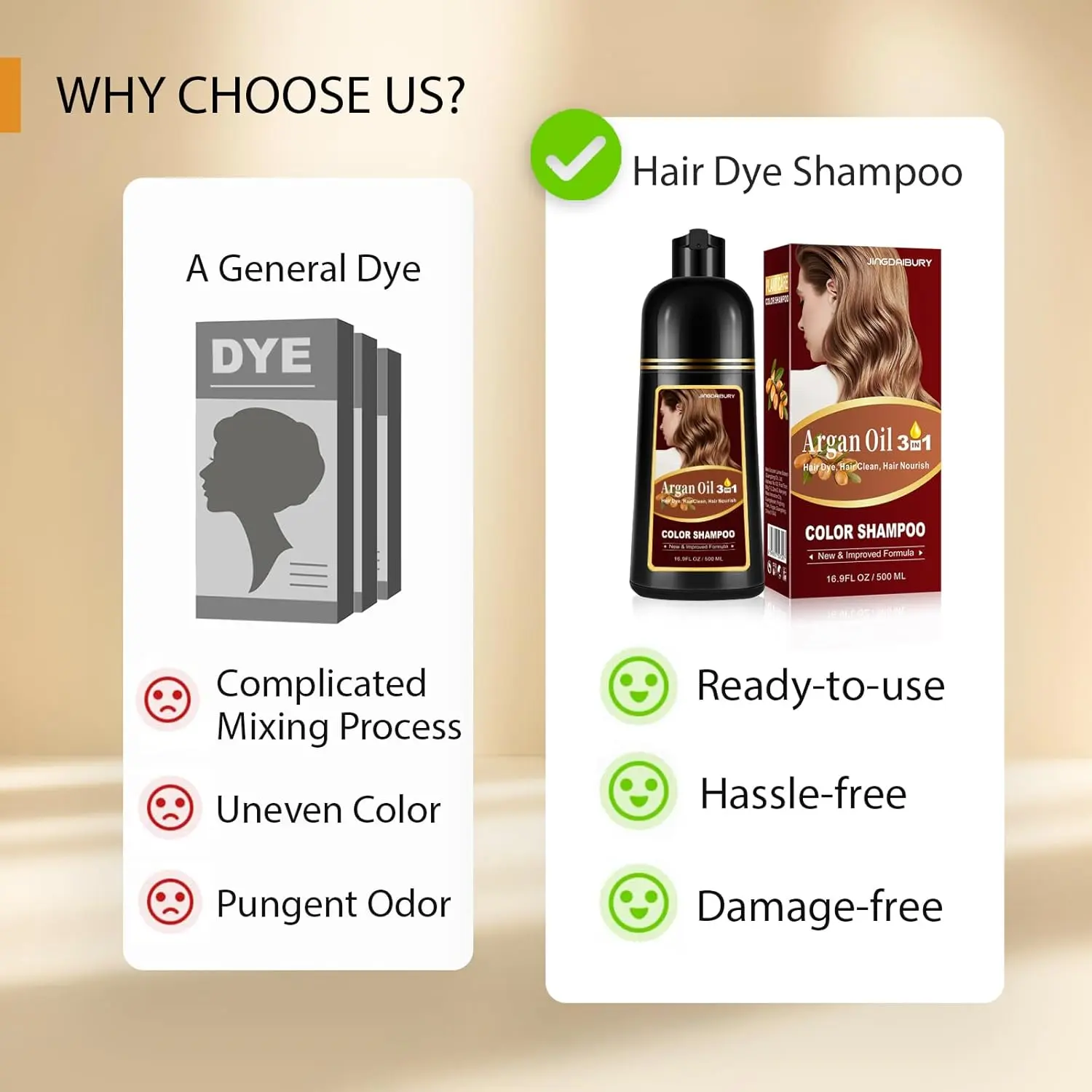 ·3-IN-1 GENTLE HAIR DYE: Unlike other regular hair dyes, this shampoo can do it all - clean, color, and take care of your hair in just one step. It'll leave your hair feeling soft, full, and super shiny, like it's come back to life.