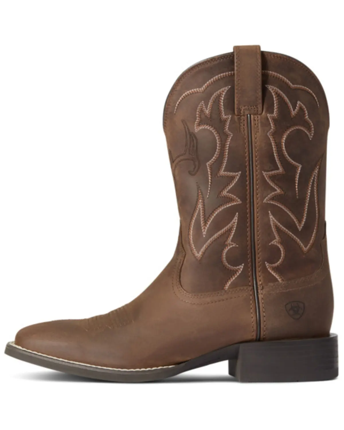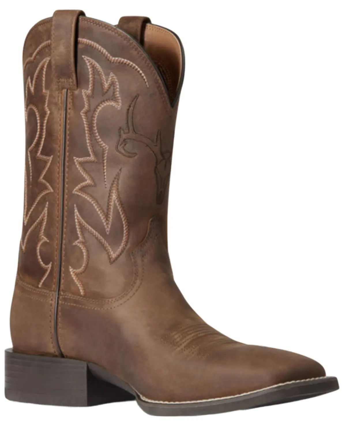 4LR™ technology provides lightweight support and stability. Duratread™ rubber outsole is extremely durable while still letting your foot flex. Full-grain leather upper with synthetic air mesh lining. 11" shaft height. Broad square toe. 1.5" stockman heel. Pull-on style with pull tabs. Solid brown design with western stitching and steer head on front. Double-stitched welt. Imported.