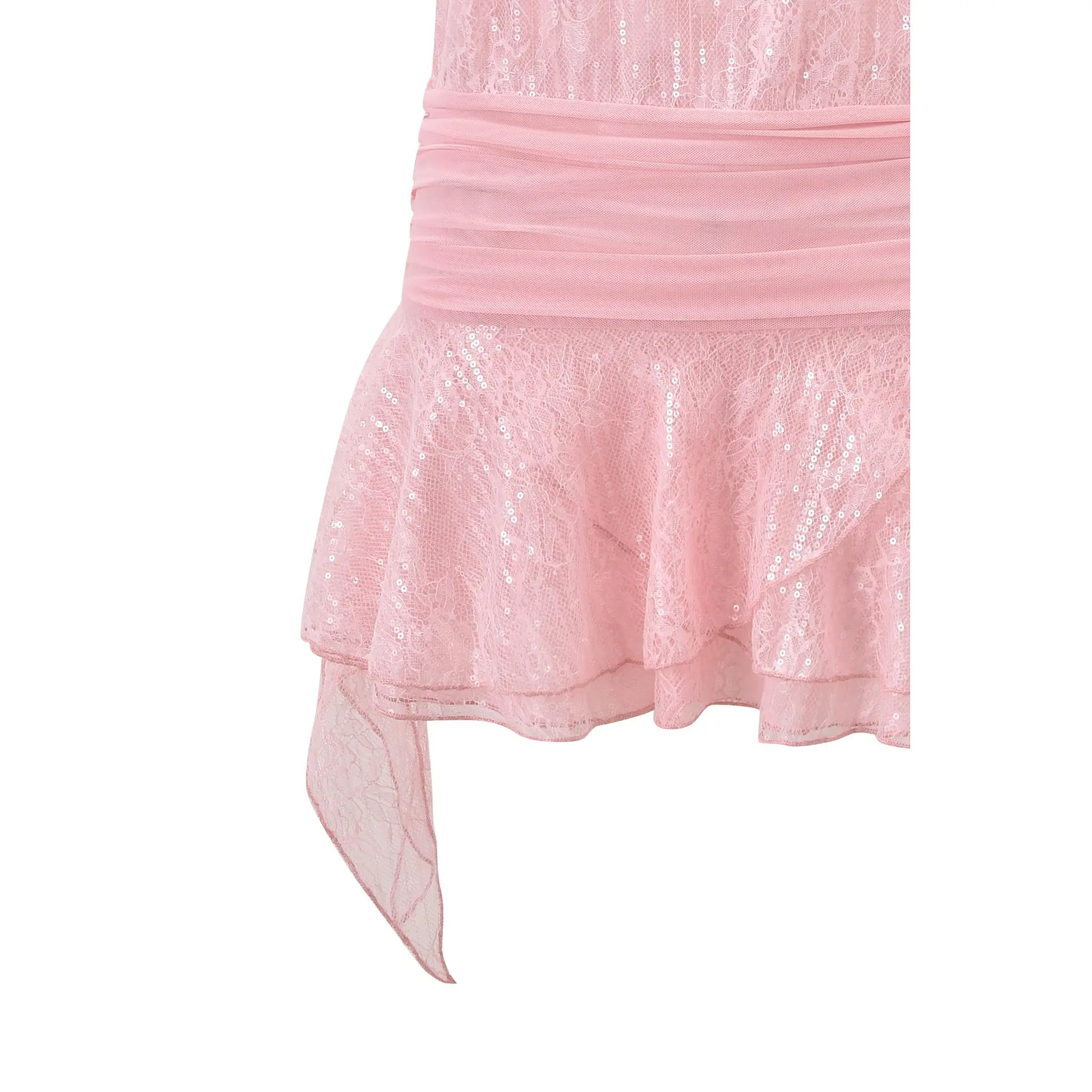 ·Finished with a ruched mesh waistband and tiered flare skirt cascading at wearer's right side