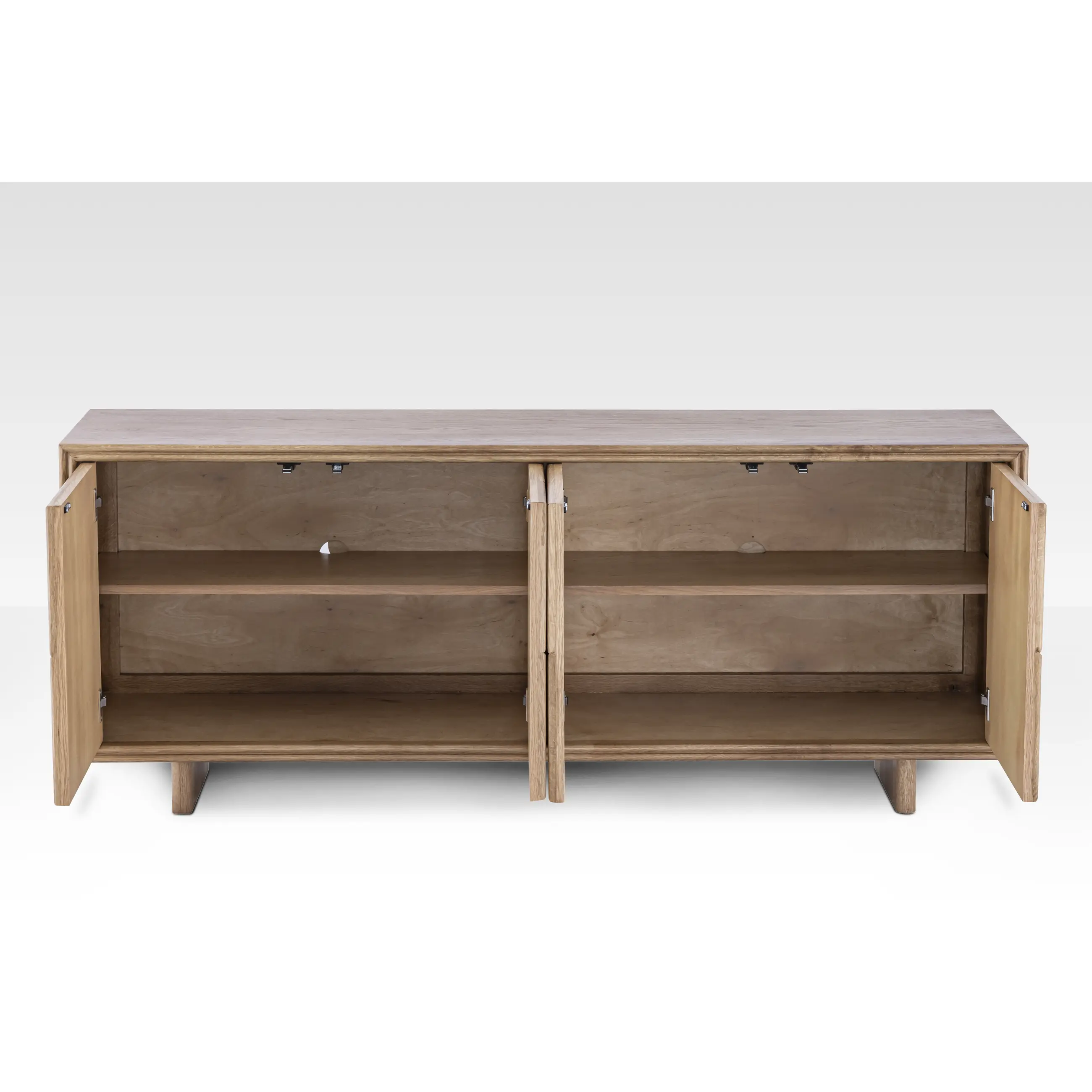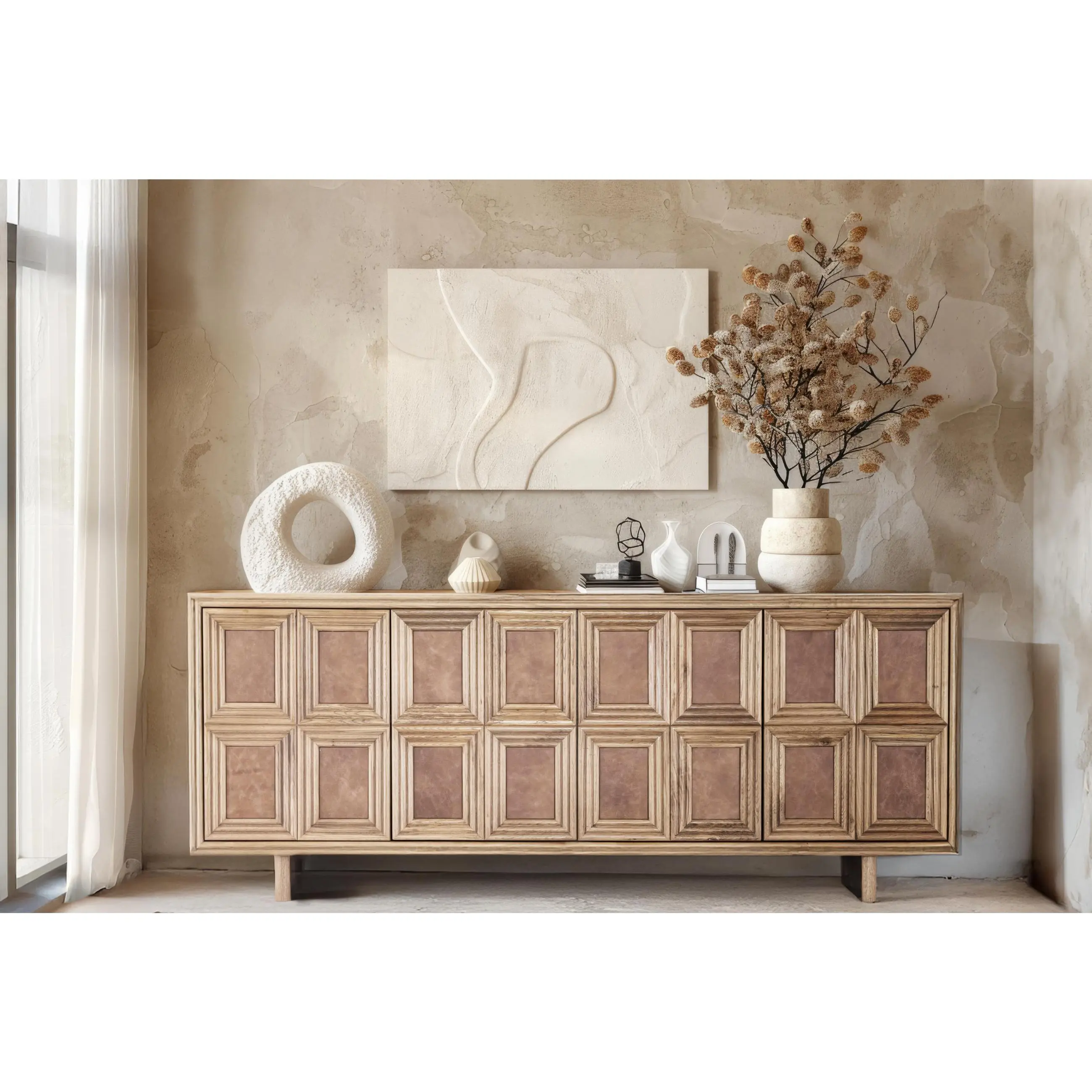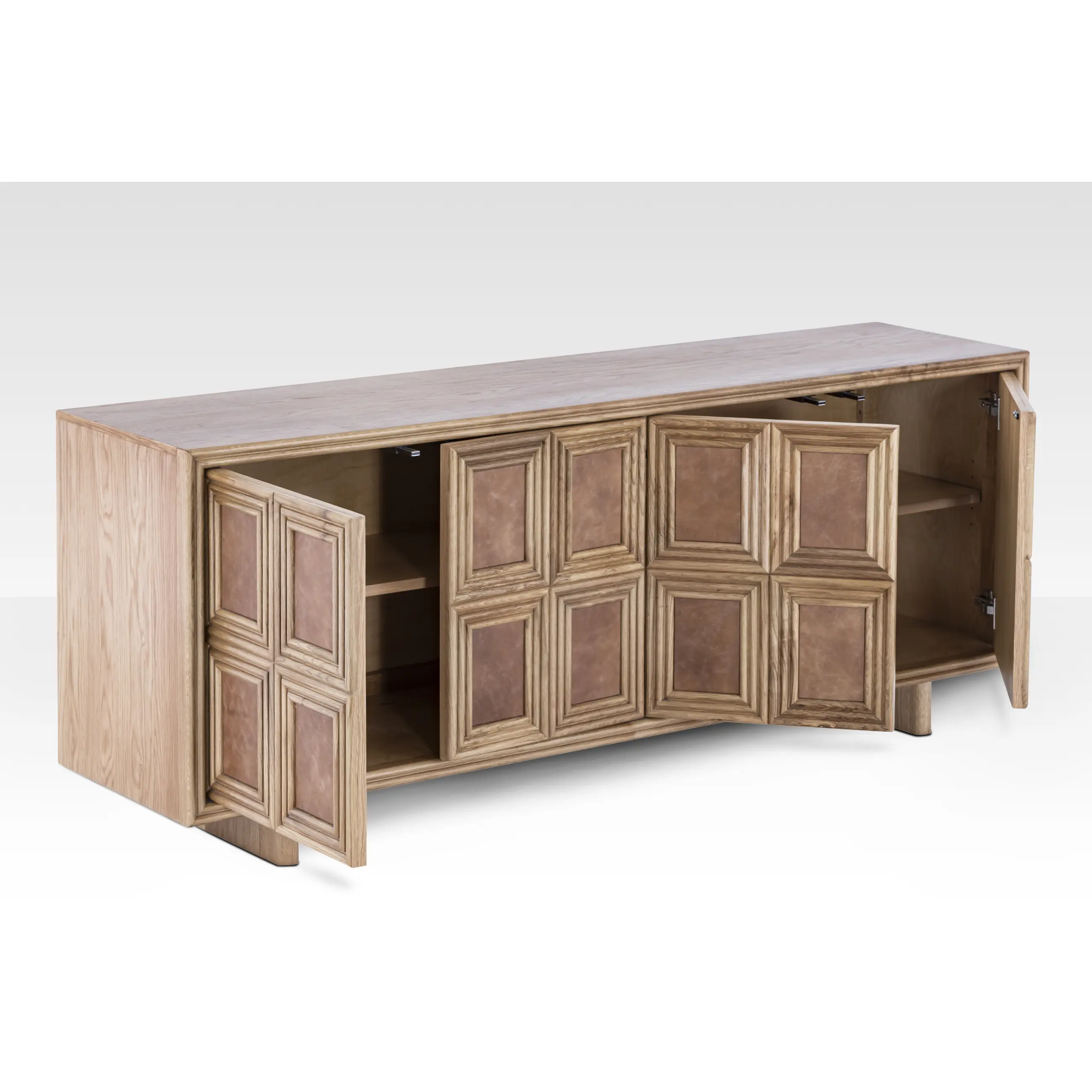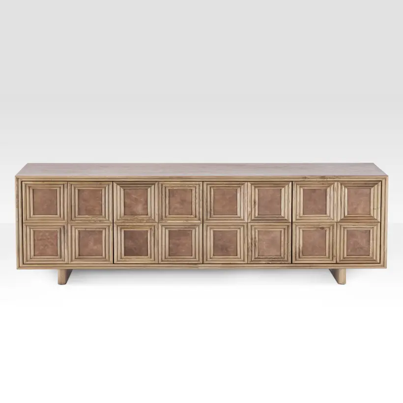 The Arka Sideboard is a handcrafted oak wood and genuine leather storage console featuring a unique rectangle-within-a-rectangle geometric design. This modern luxury sideboard serves as a focal point for living rooms or dining areas, offering functional storage with a natural grain leather center and premium Hettich hinges. It is an ideal choice for high-end minimalist or contemporary home decor.