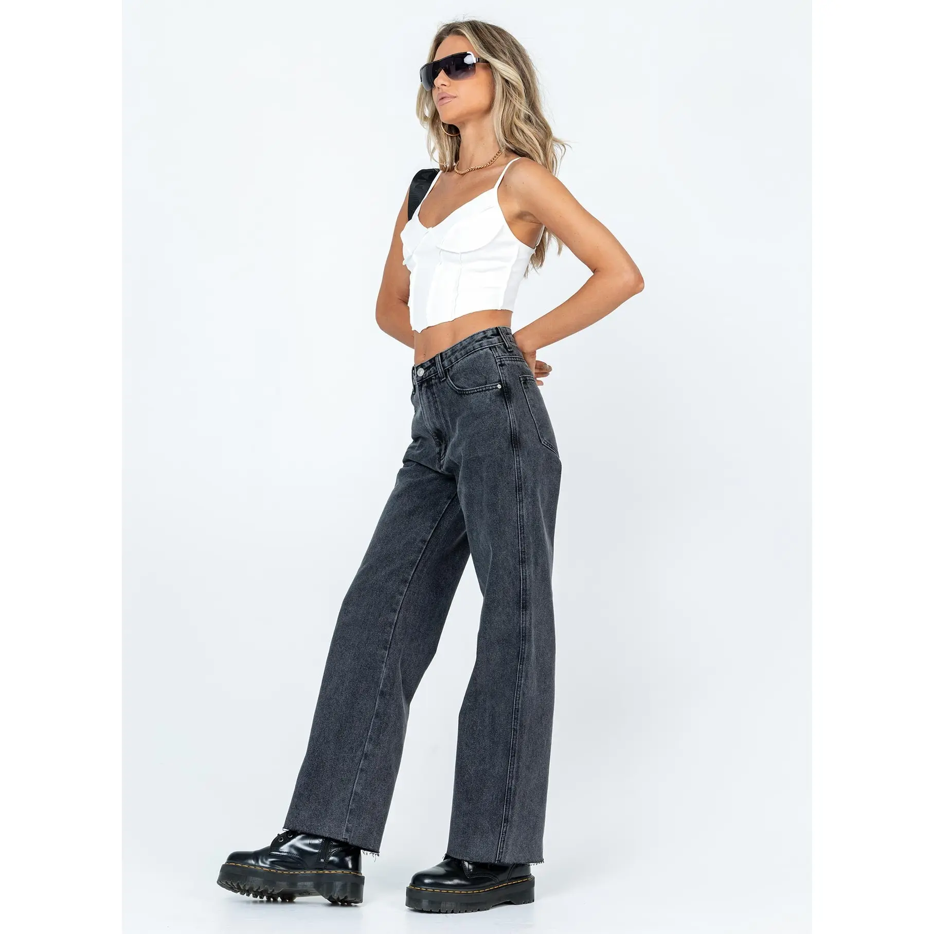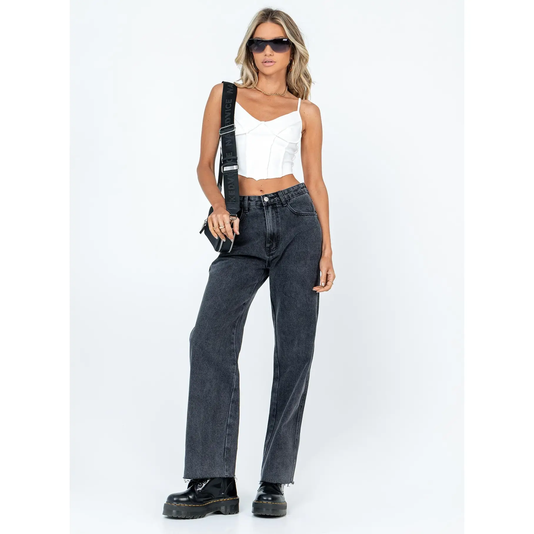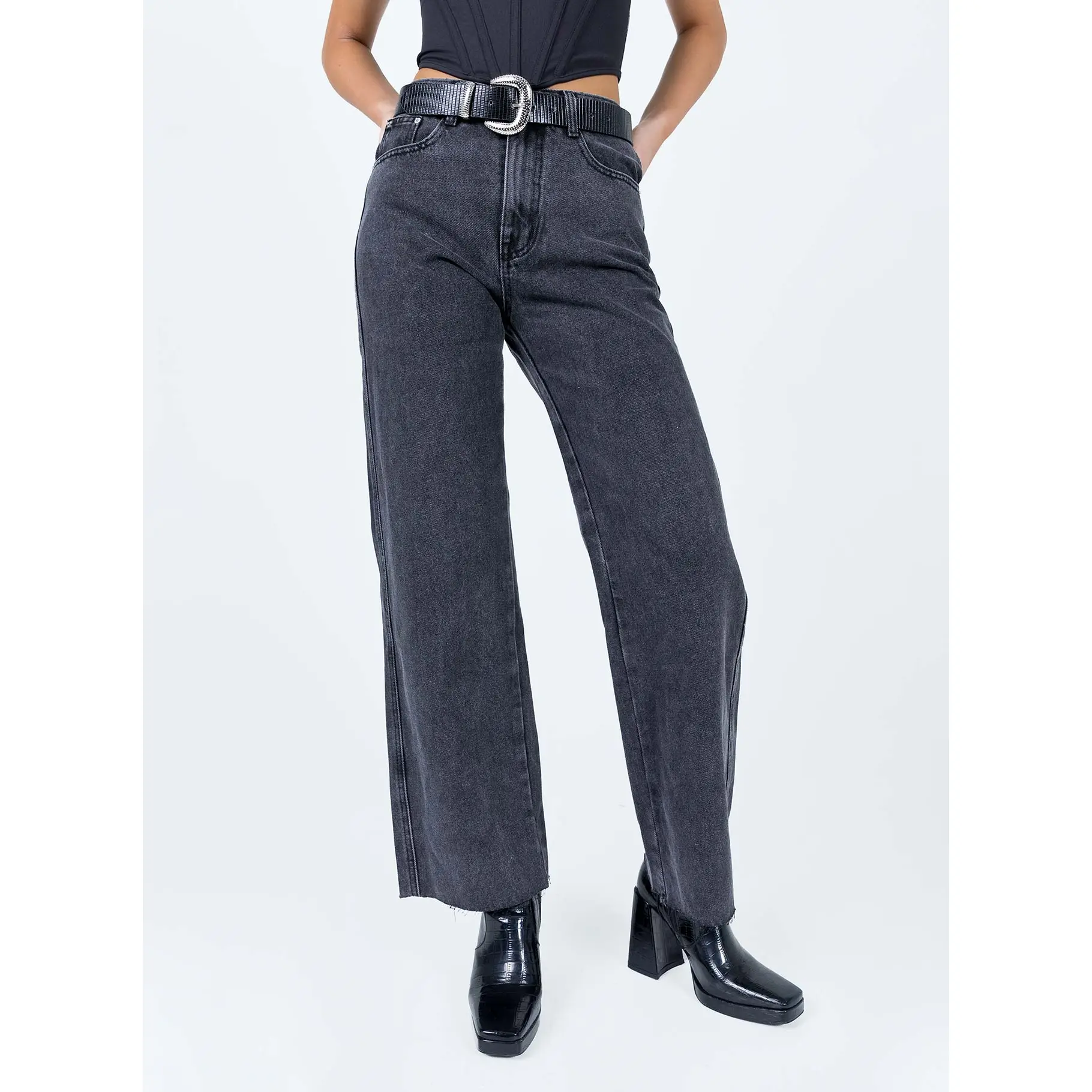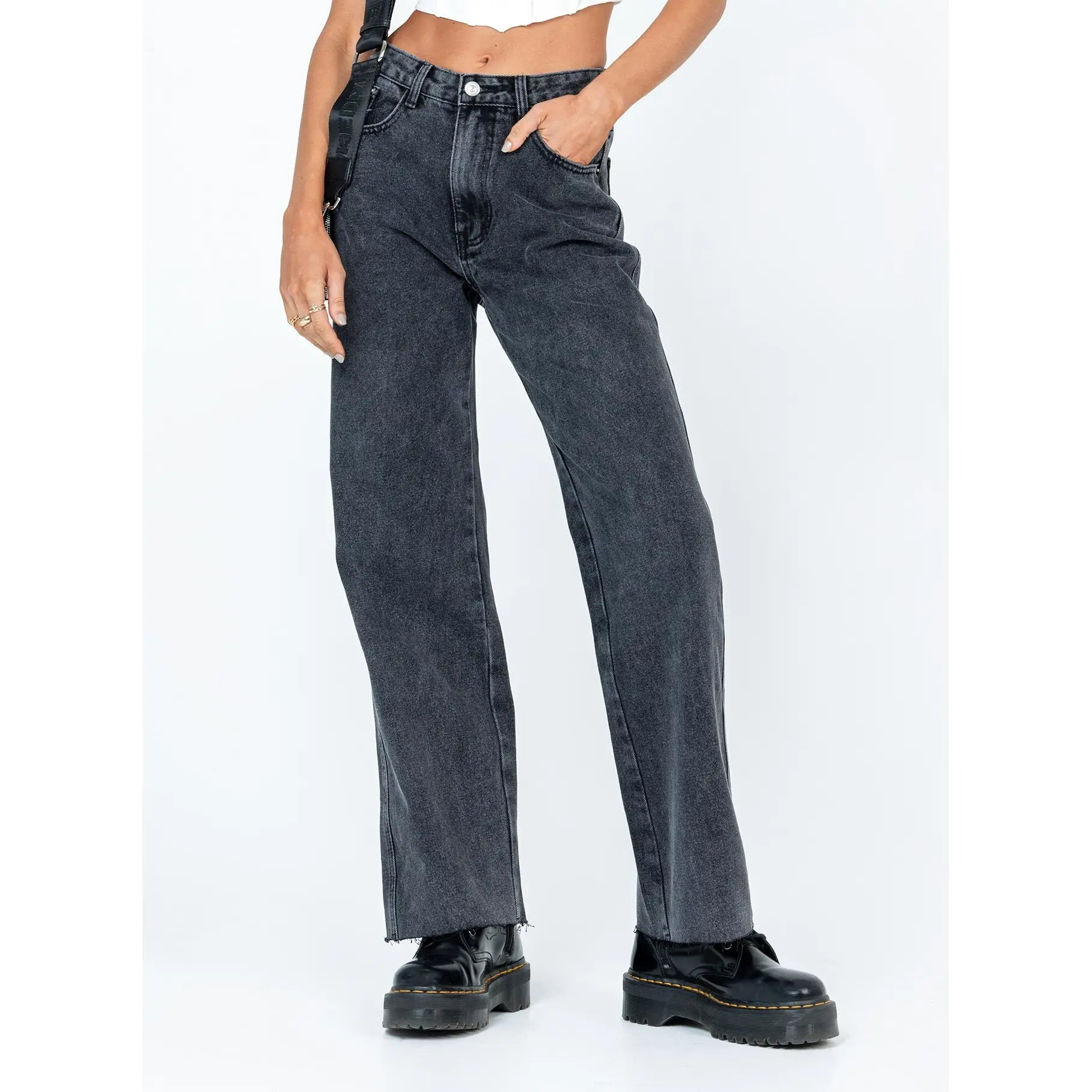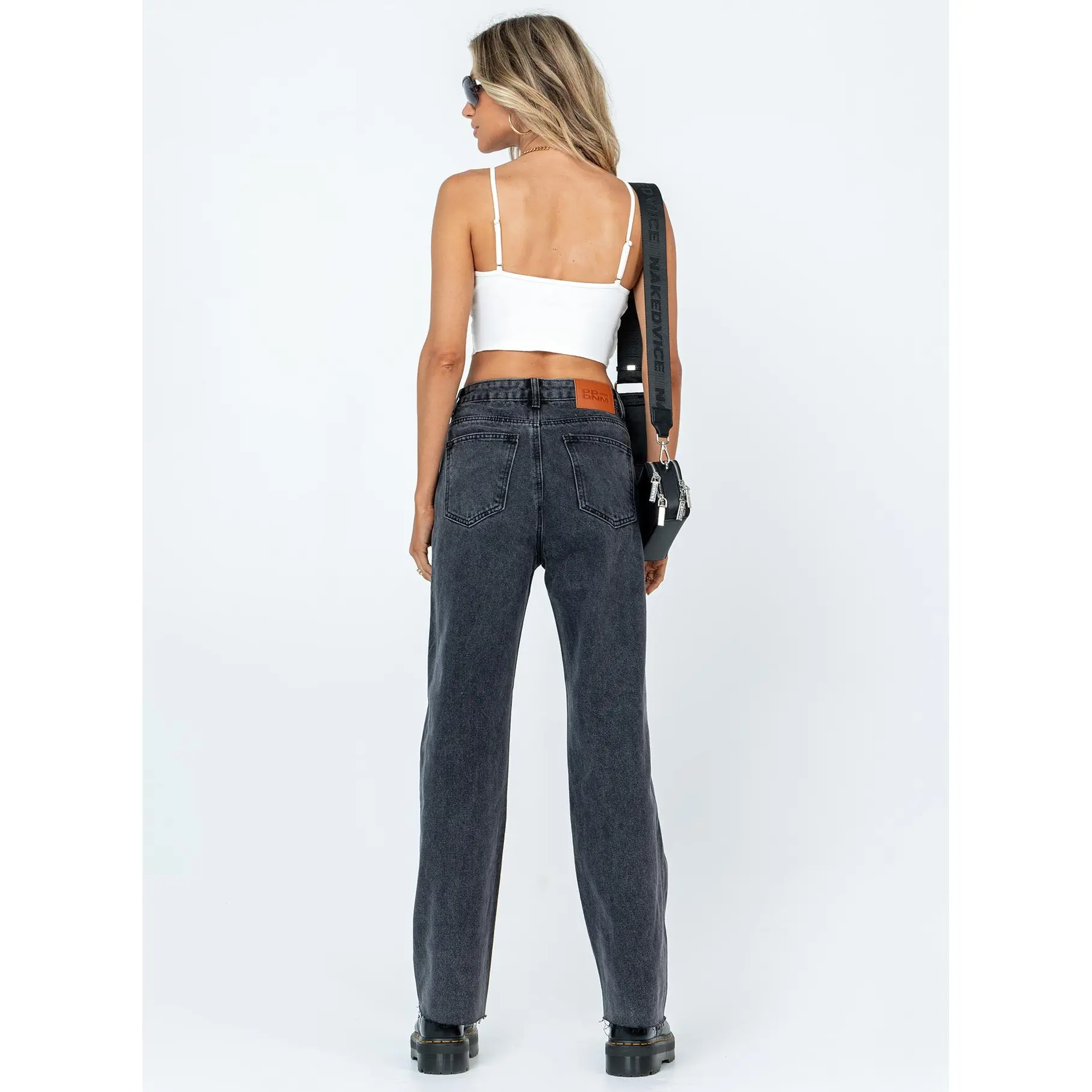 ·Belt looped waist, button & zip closure, five pockets, raw cut hem, branded patch at back