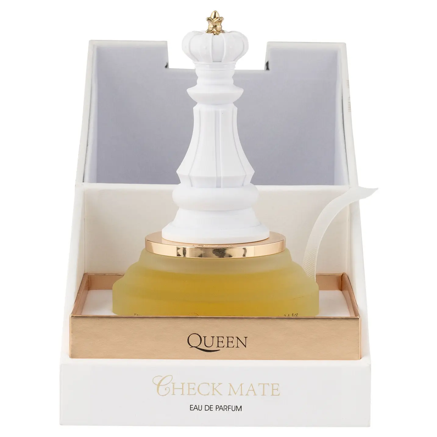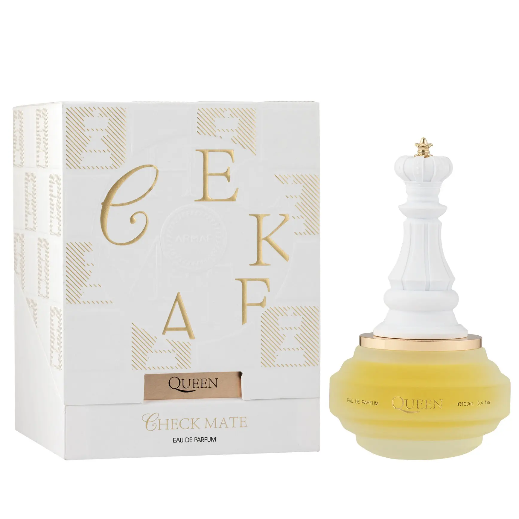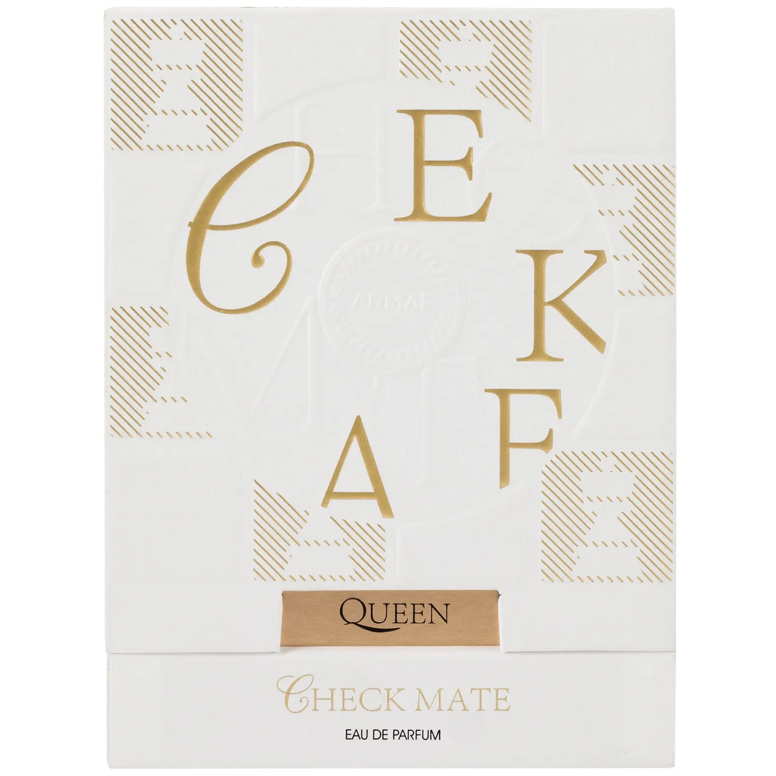 The product comes in a striking box with a gold "QUEEN" label. The box design adds to the premium feel of the Armaf Checkmate Queen Eau de Parfum. Ideal for gifting or personal use, this perfume is a standout choice.