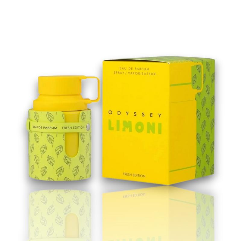 The image showcases the fragrance bottle. It features the names Aramf, Odyssey, Spectra, Limoni, Tyrant, and Mega.