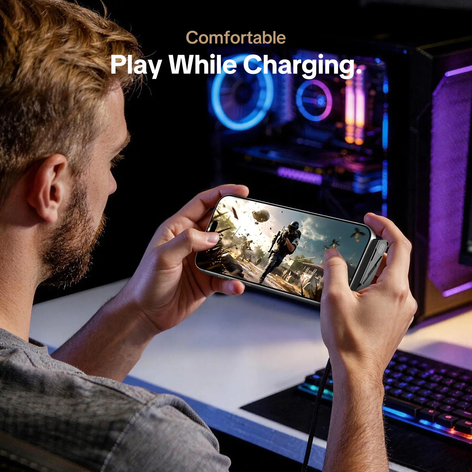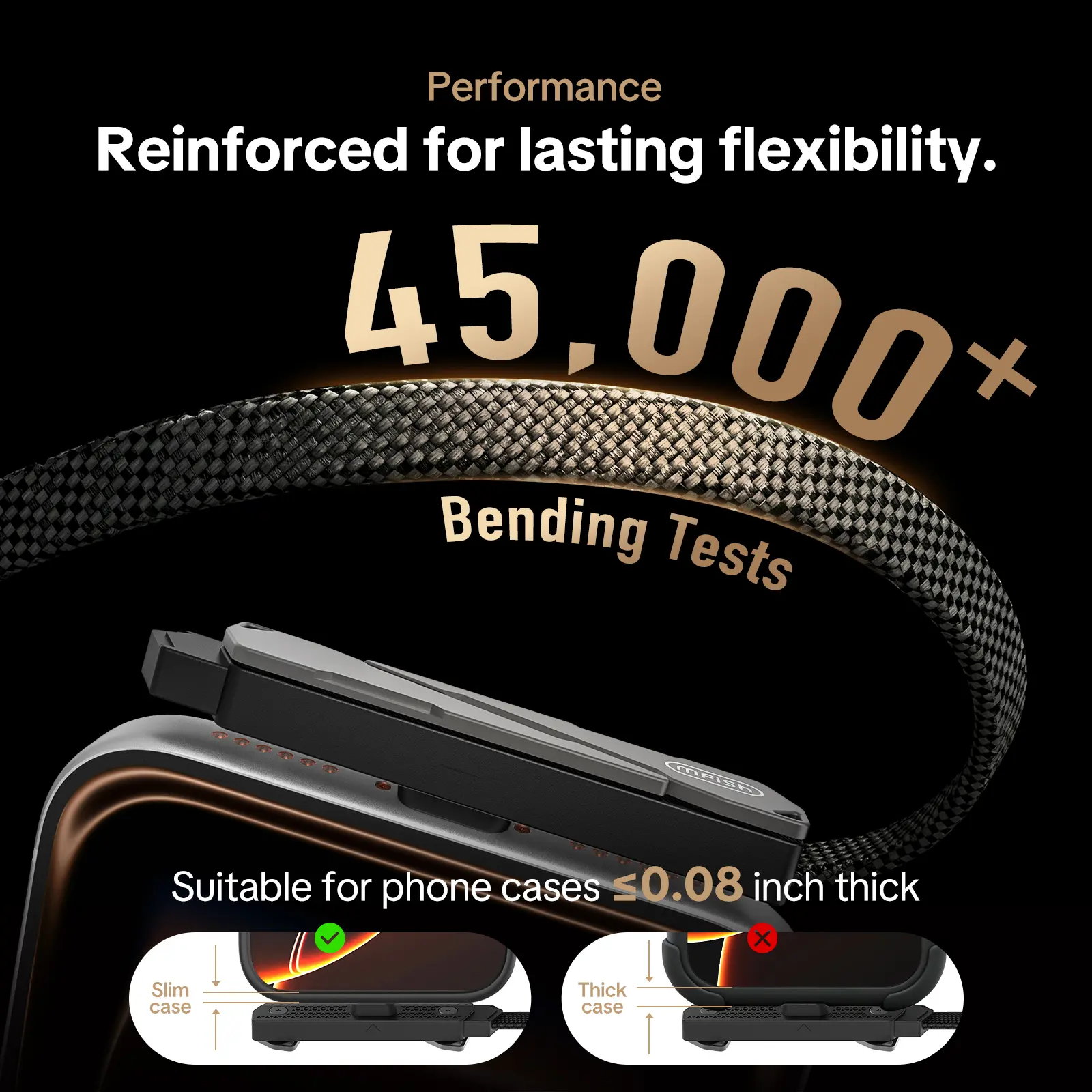 ·90° Elbow Design: The 90-degree bend keeps cables out of the way while gaming or using your device, letting you charge effortlessly without compromising grip or hand feel. Tested for stable use, our cable is compatible with most phone cases (≤0.08 in thick, ≥0.45 in port openings), but for thicker cases, raised bottom edges, or smaller port openings, we recommend removing the case or purchasing with caution