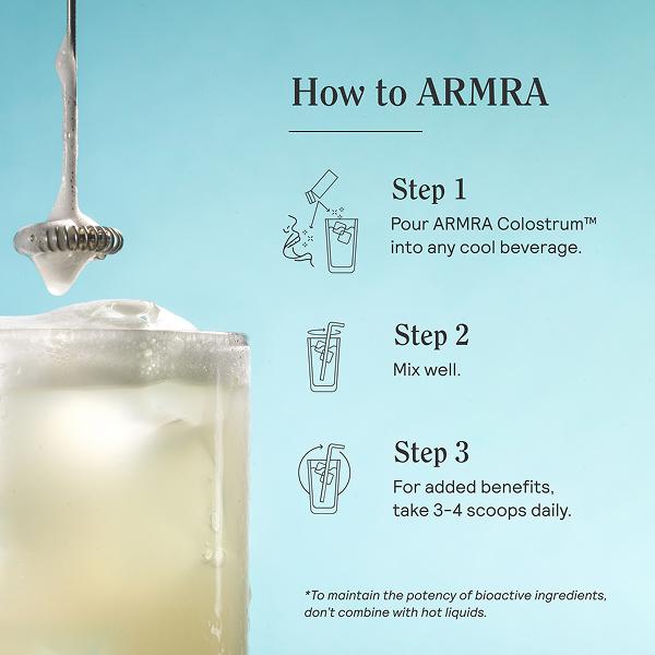 ARMRA Colostrum can be easily stirred into liquid, mixed with things like yogurt, or sprinkled into any other food, as long as it isn’t hot, as this can degrade its 400+ bioactive compounds. For the most potent benefits, many customers enjoy dry scooping ARMRA Unflavored directly into their mouth to maximize contact with the mucosal surfaces of the mouth and esophagus. Additionally, it doesn’t matter what time of day you take it — whenever works best for you to incorporate your 4+ scoops into your daily routine.