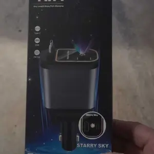 This starry sky car charger is a 4-in-1 device equipped with a Type-C retractable cable, an IOS retractable cable, and additional USB-C and USB-A ports. It allows fast charging of up to four devices simultaneously. Compatible with iPhone 15/14/13 Pro Max Plus, iPad, AirPods, Samsung Galaxy S23/S22/S10, and Google smartphones.