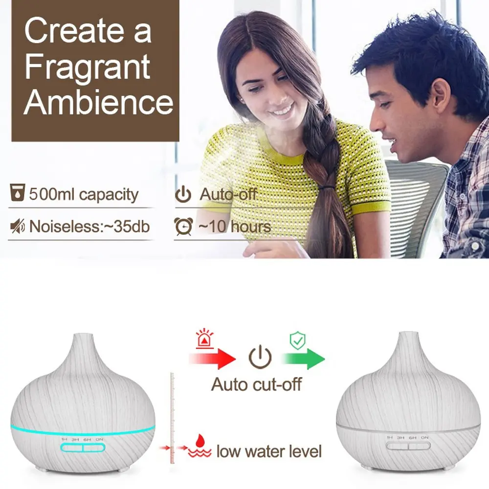 500ml Aromatherapy  Diffuser Wood Grain Remote Control Ultrasonic Air Humidifier Cool 7 Color LED Light