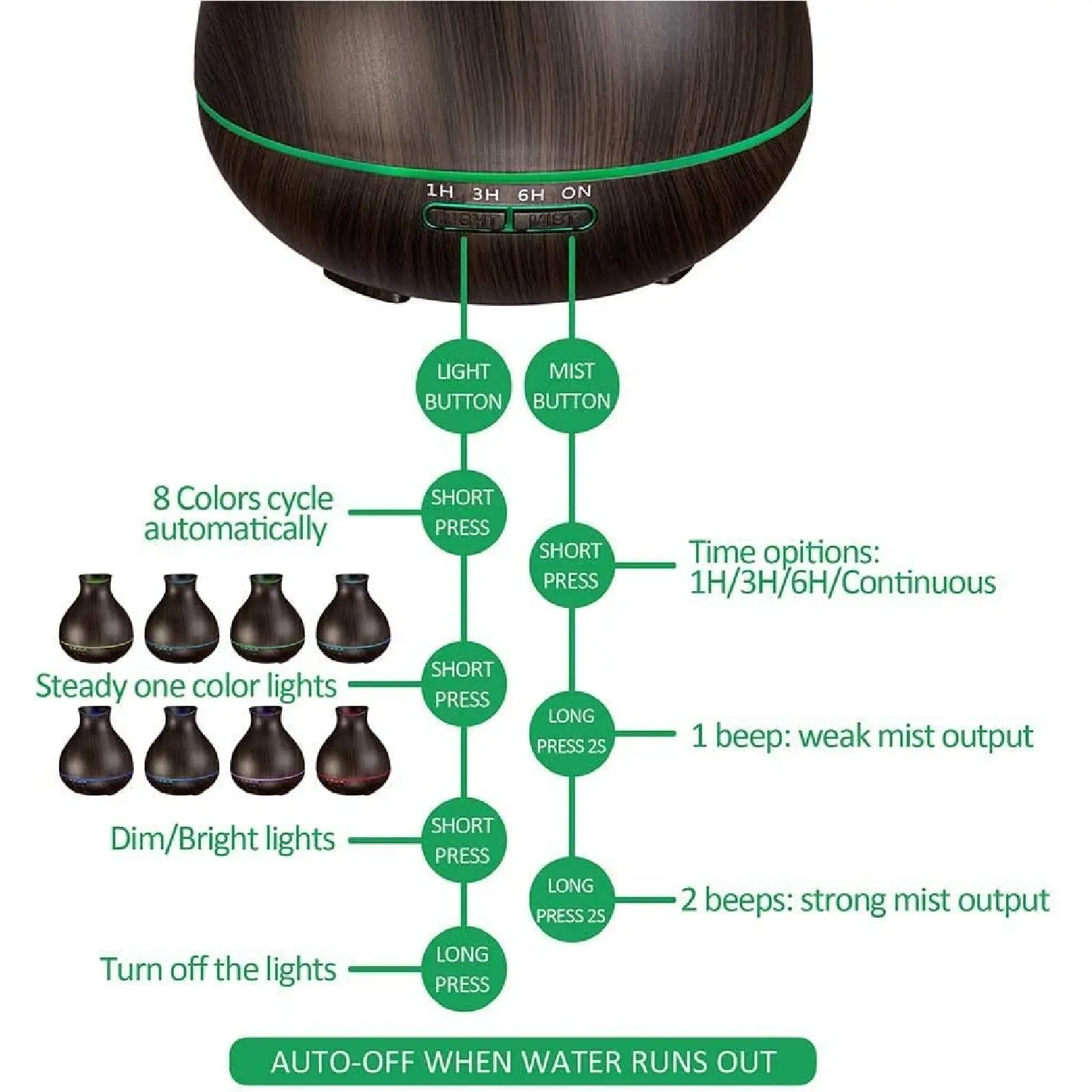 EXCELLENT SAFETY --It has a timer setting and spray control, with an automatic extinguish function without water. You can continue to use this aromatherapy diffuser at night without worrying about overheating as it has a waterless auto shut-off function to ensure the safety of you and your family. You can also change the light according to your preference by choosing different light modes and timer setting. The three-time setting for option: 1/3/6H timer.