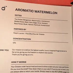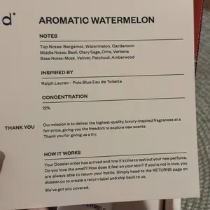 Top: The first notes you smell - Bergamot, Watermelon, Cardamom