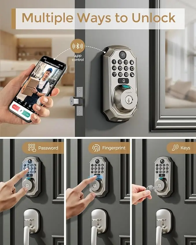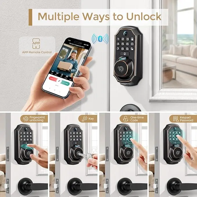 Multiple Ways to Unlock: User could unlock the front door lock via APP Access, Fingerprint, Keypad Code, Traditional Keys. Say goodbye to fumbling for keys or worrying about lost or duplicated keys. The AI fingerprint sensor provides a quick and secure way to enter your home.
